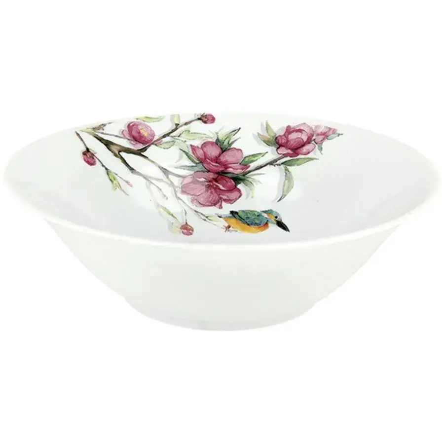 Превратите обычный обед в праздничное мероприятие с глубокой фарфоровой тарелкой, украшенной авторской росписью. Нежный цветочный орнамент с акварельными переходами и декоративной птицей создаёт атмосферу весеннего сада на вашем столе.