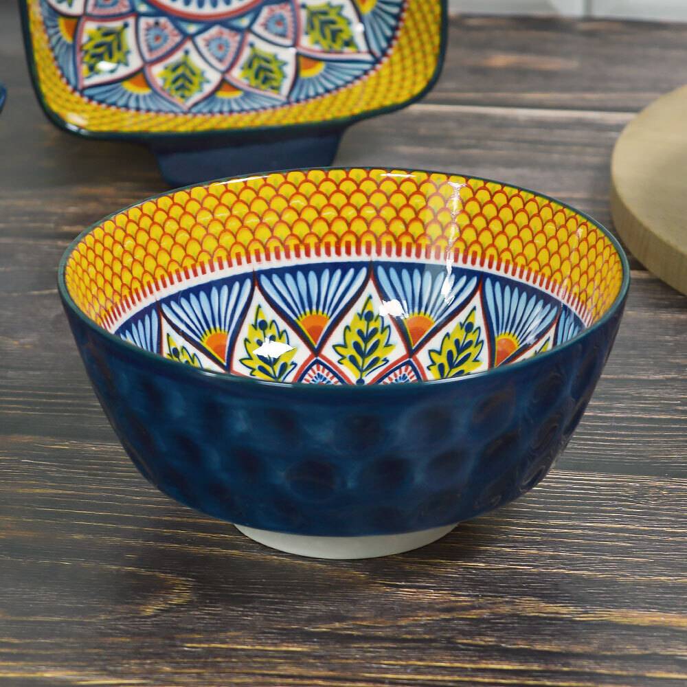 Салатник "Arabesque" диаметром 16 см — это не просто посуда, а настоящая находка для вашего стола. Яркий цветочный и геометрический узор внутри чаши, включающий желтые, синие и зеленые элементы, добавляет яркости и стиля в любое застолье. Этот салатник станет не только функциональным элементом сервировки, но и стильным акцентом вашего интерьера.