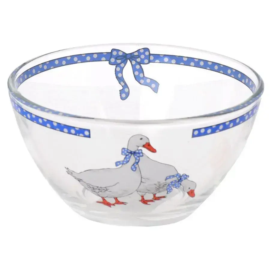 Прозрачная стеклянная ёмкость с авторским рисунком гусей станет изюминкой сервировки. Объём 400 мл и удобный диаметр 13 см идеально подходят для подачи салатов, закусок или десертов.