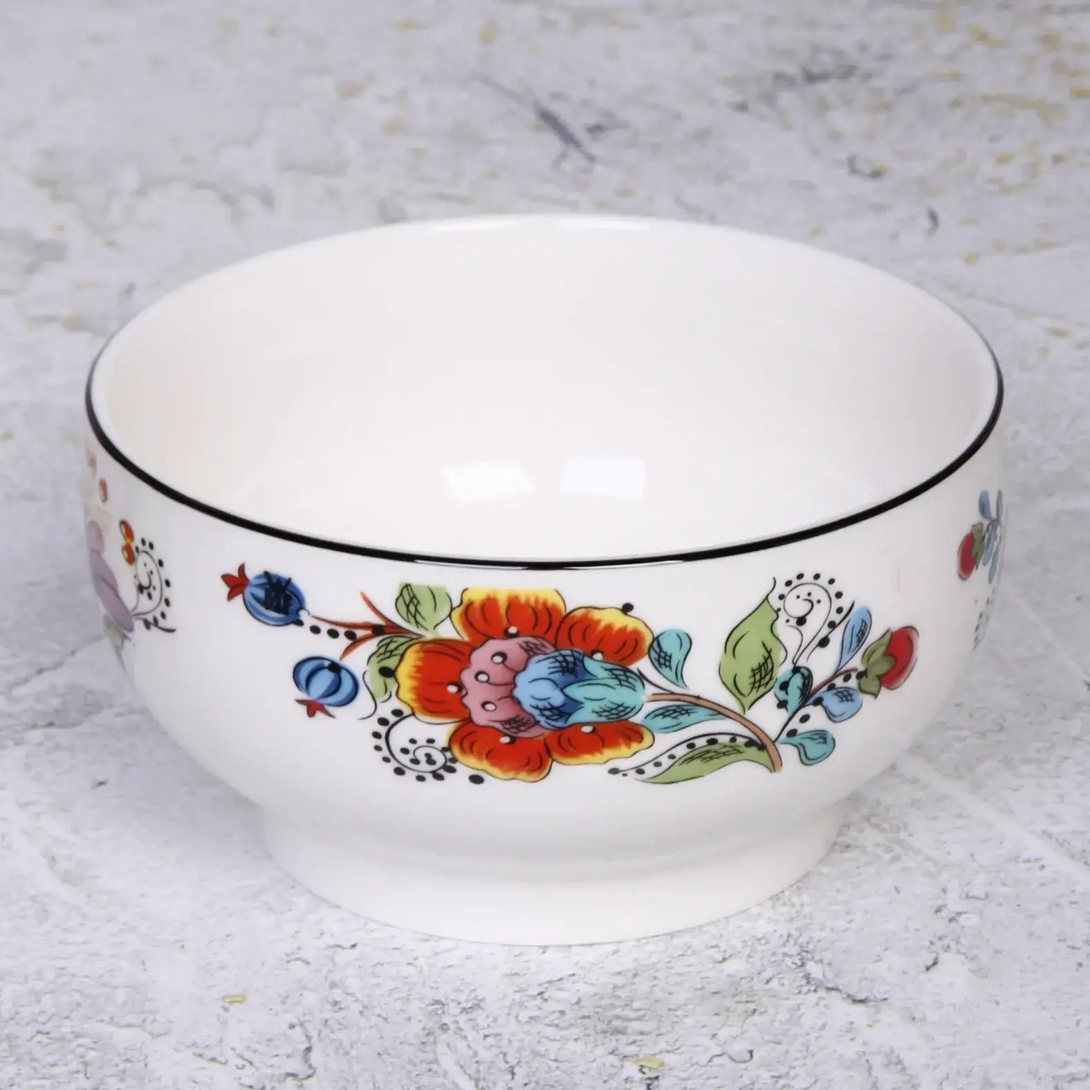 - Чёрная кантовка по краю подчёркивает изящество цветочного орнамента