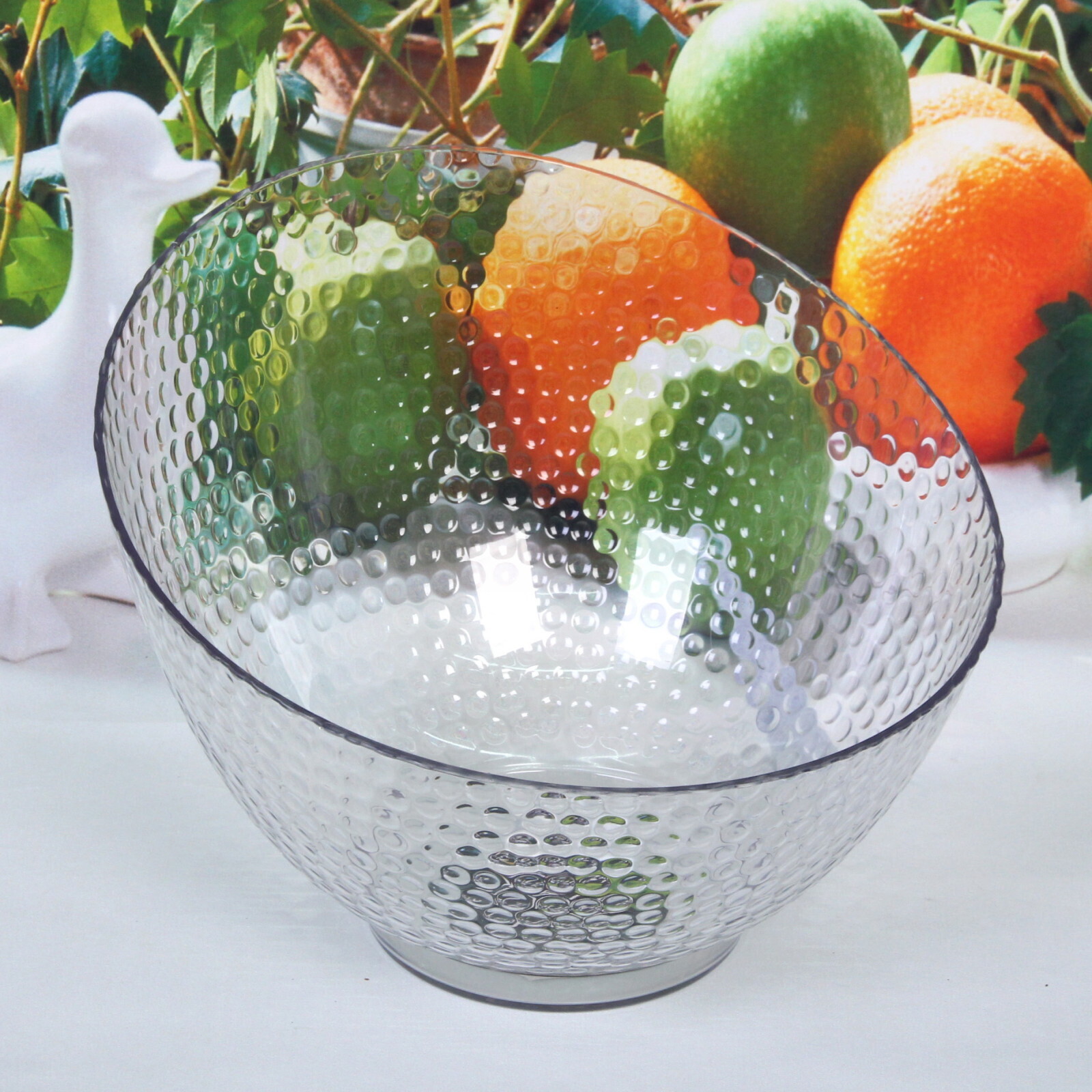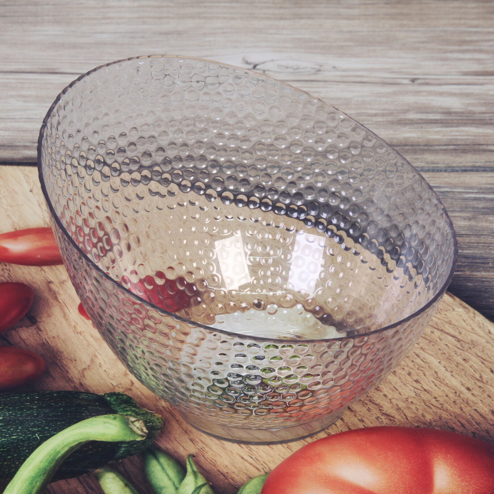 Салатник выполнен из качественного пластика, что делает его легким и устойчивым к повреждениям. Его размеры 22х17 см позволяют использовать его для различных блюд, от салатов до закусок. Прозрачный цвет и рифлёная текстура делают его универсальным элементом на вашей кухне.