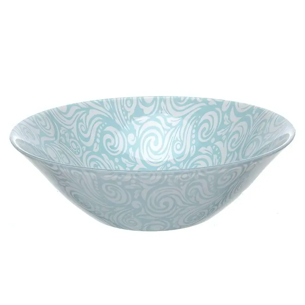 Классическая круглая форма с декоративным голубым орнаментом органично впишется в любой интерьер. Утолщённые стенки (3 мм) обеспечивают долговечность, а прозрачная структура позволяет контролировать содержимое. Специальная обработка краёв предотвращает сколы при контакте со столовыми приборами.