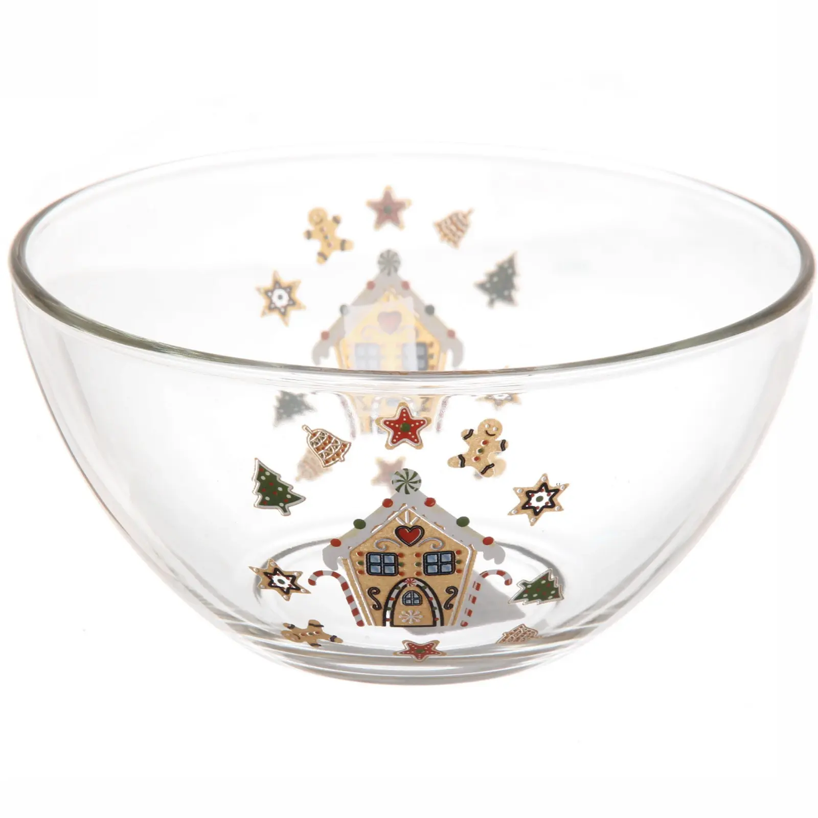 Характеристики: объем 800 мл, диаметр около 18 см, высота 6 см, изготовлен из стекла, украшен яркими новогодними рисунками с пряничными домиками, елками, звездами и фигурками имбирных человечков, что делает его отличным выбором для праздничных интерьеров и теплой атмосферы. Легко очищается и подходит для мытья в посудомоечной машине.
