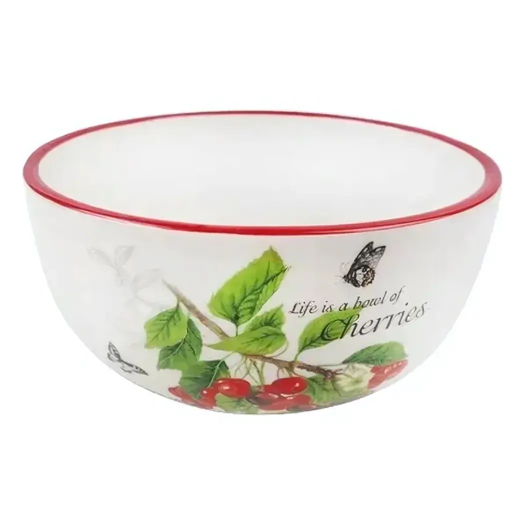 Диаметр 14 см оптимален для порционных блюд. Белая основа с красным кантом подчеркивает изысканность декора. Надпись "Life is a bowl of Cherries" добавляет философский шарм сервировке. Изготовлен из экологичной керамики, безопасной для пищевого использования.