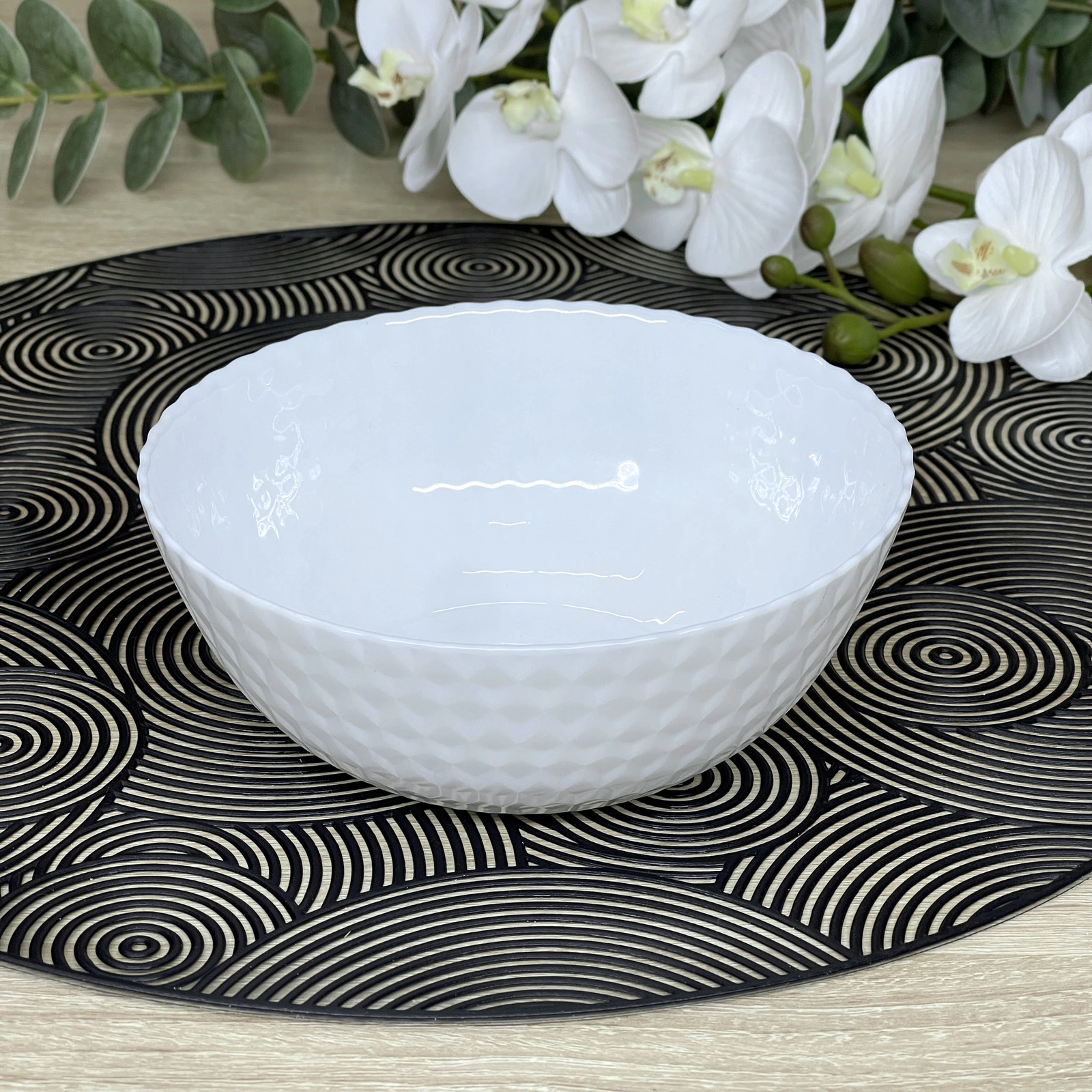 Рельефные ромбы на внешней стороне создают интересную игру света и добавляют текстуру, а универсальный белый цвет сочетается с любой посудой и текстилем. Такой салатник можно использовать как самостоятельный акцент или как часть сервировочного набора в едином стиле.