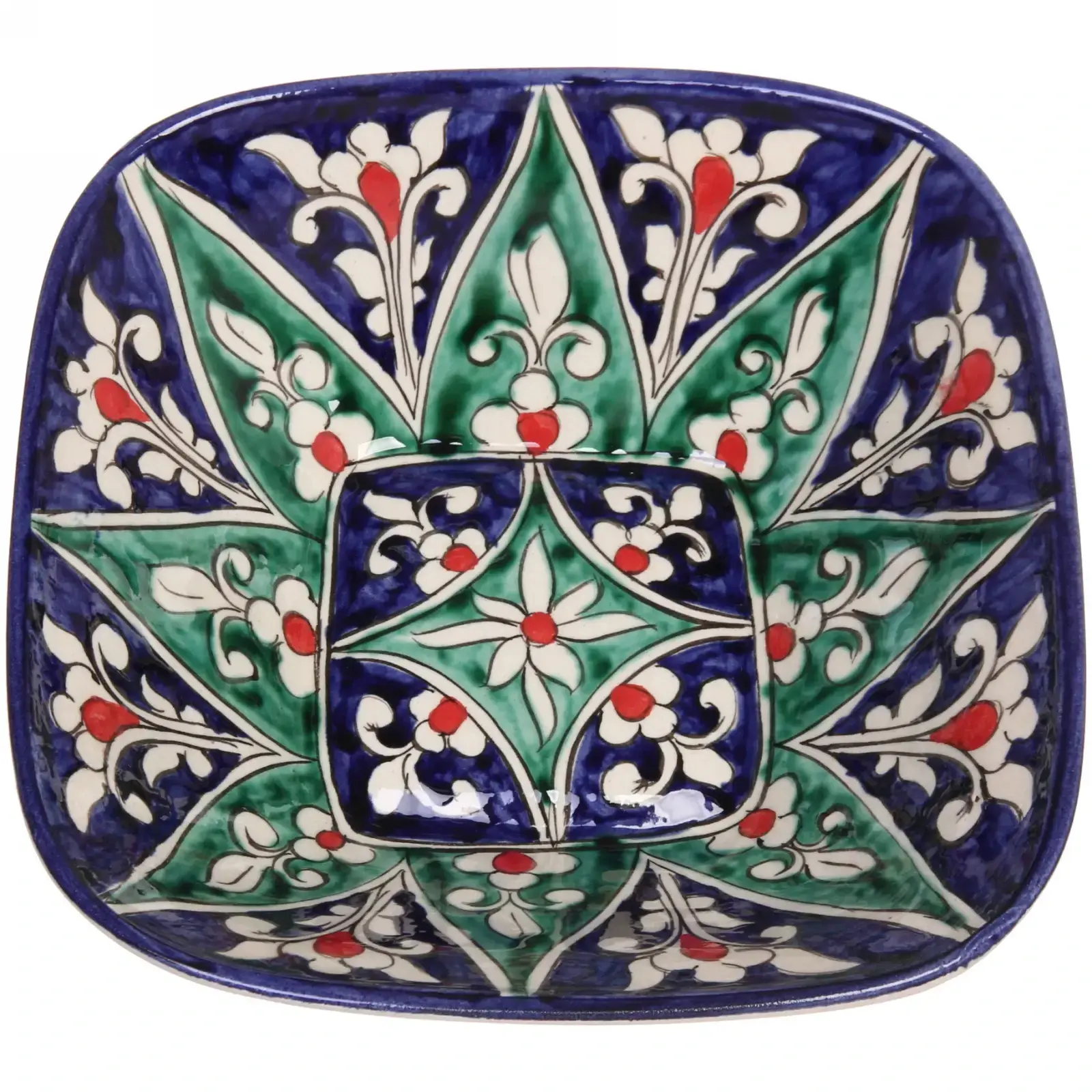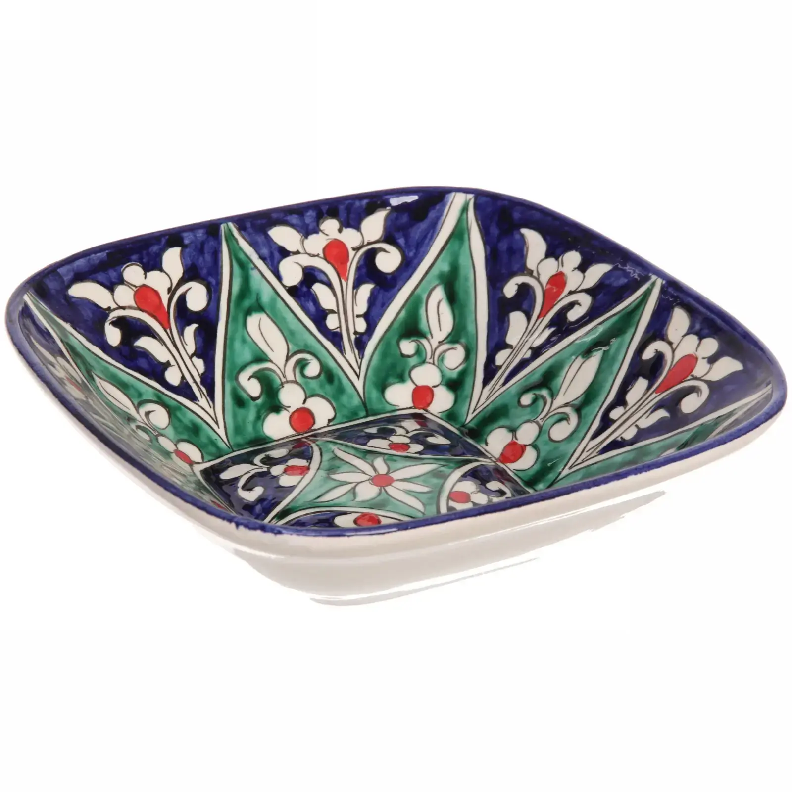 Салатница имеет квадратную форму с закругленными углами, что делает её удобной для сервировки. Яркие цвета и узоры, включающие синий, зеленый, красный и белый, создают атмосферу праздника и поднимают настроение. Она идеально подходит для семейных обедов, вечеринок или просто для повседневного использования.