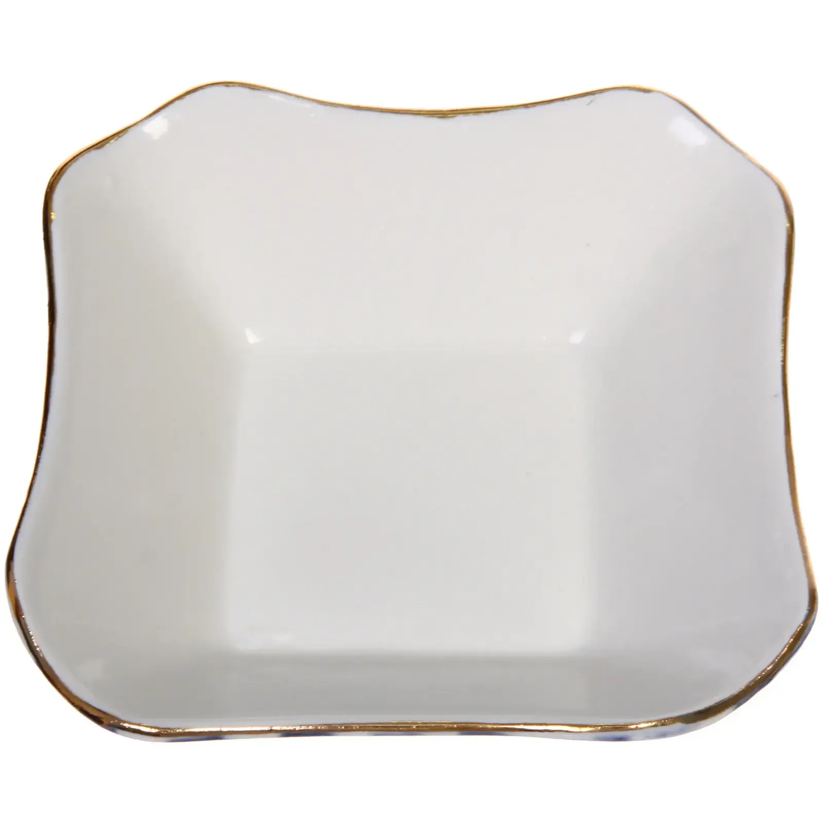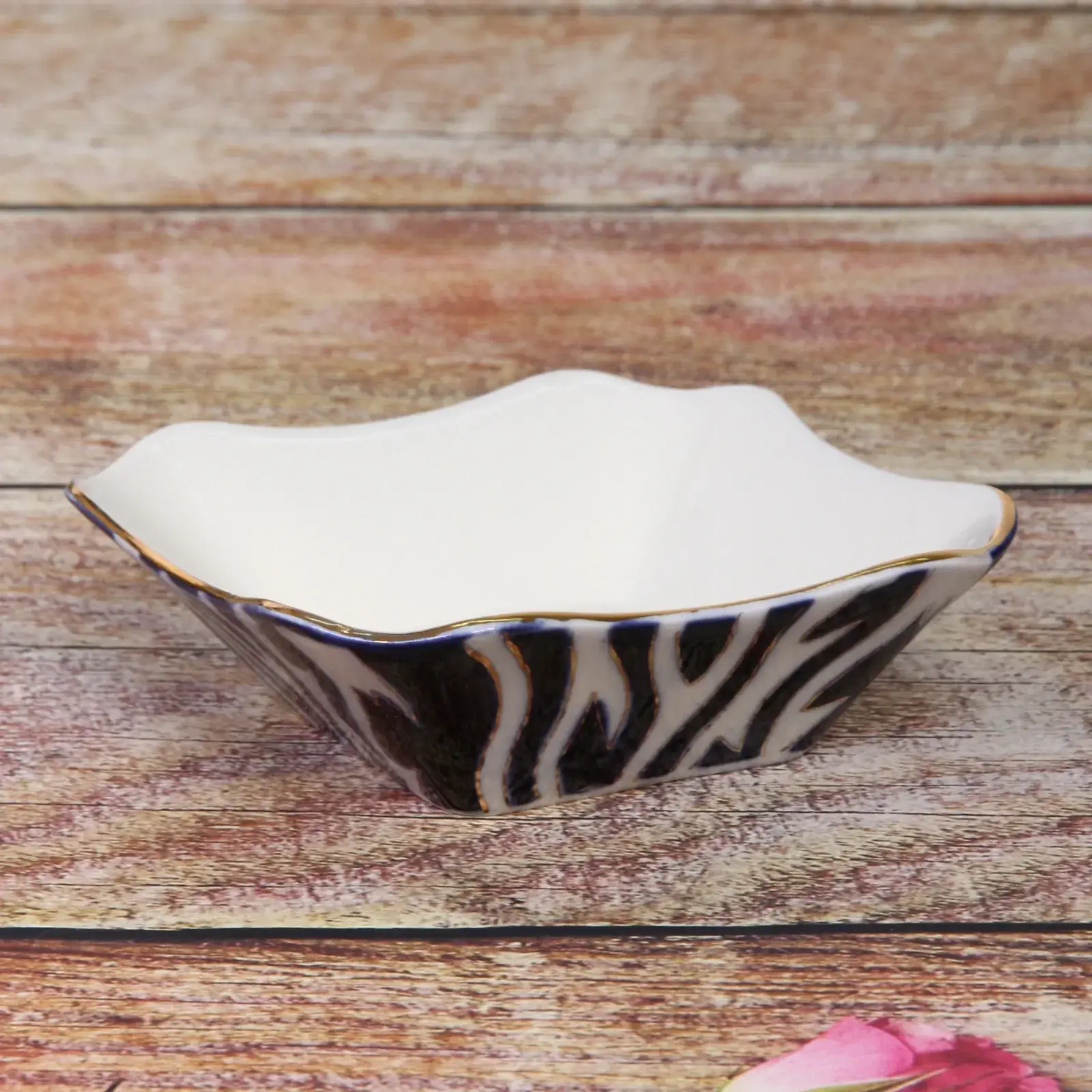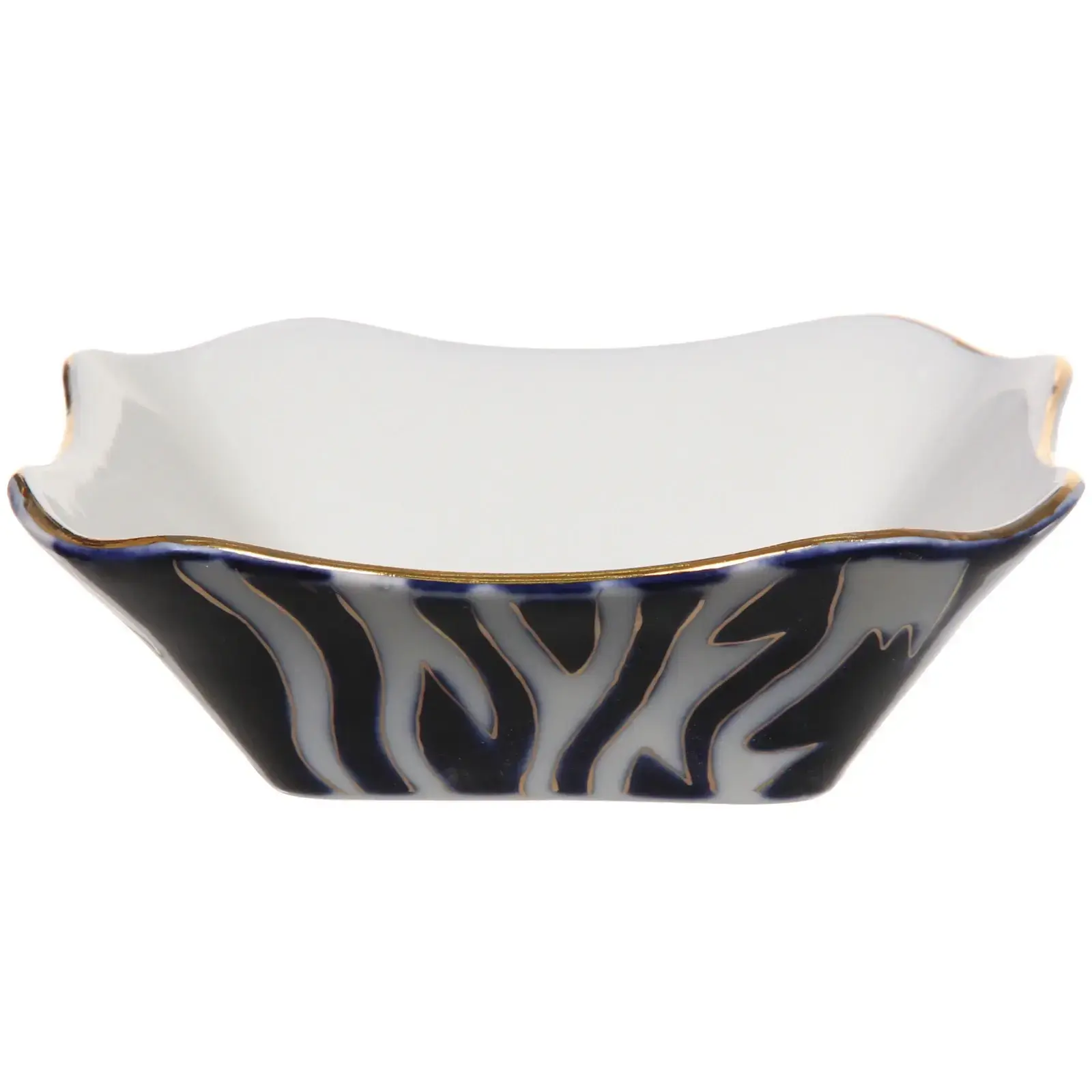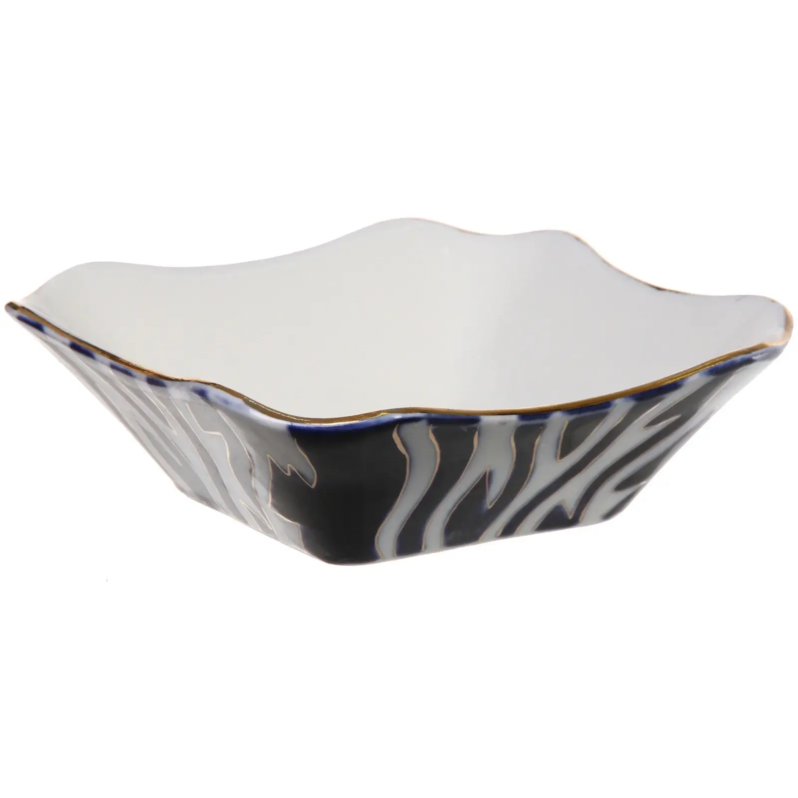 Салатница имеет объём 150мл и квадратную форму с волнистыми краями, что добавляет ей оригинальности. Основной цвет — белый, с черными и золотыми узорами, что делает её универсальной для любого интерьера. Размеры и форма позволяют удобно подавать различные блюда, а гладкая поверхность облегчает уход за посудой.