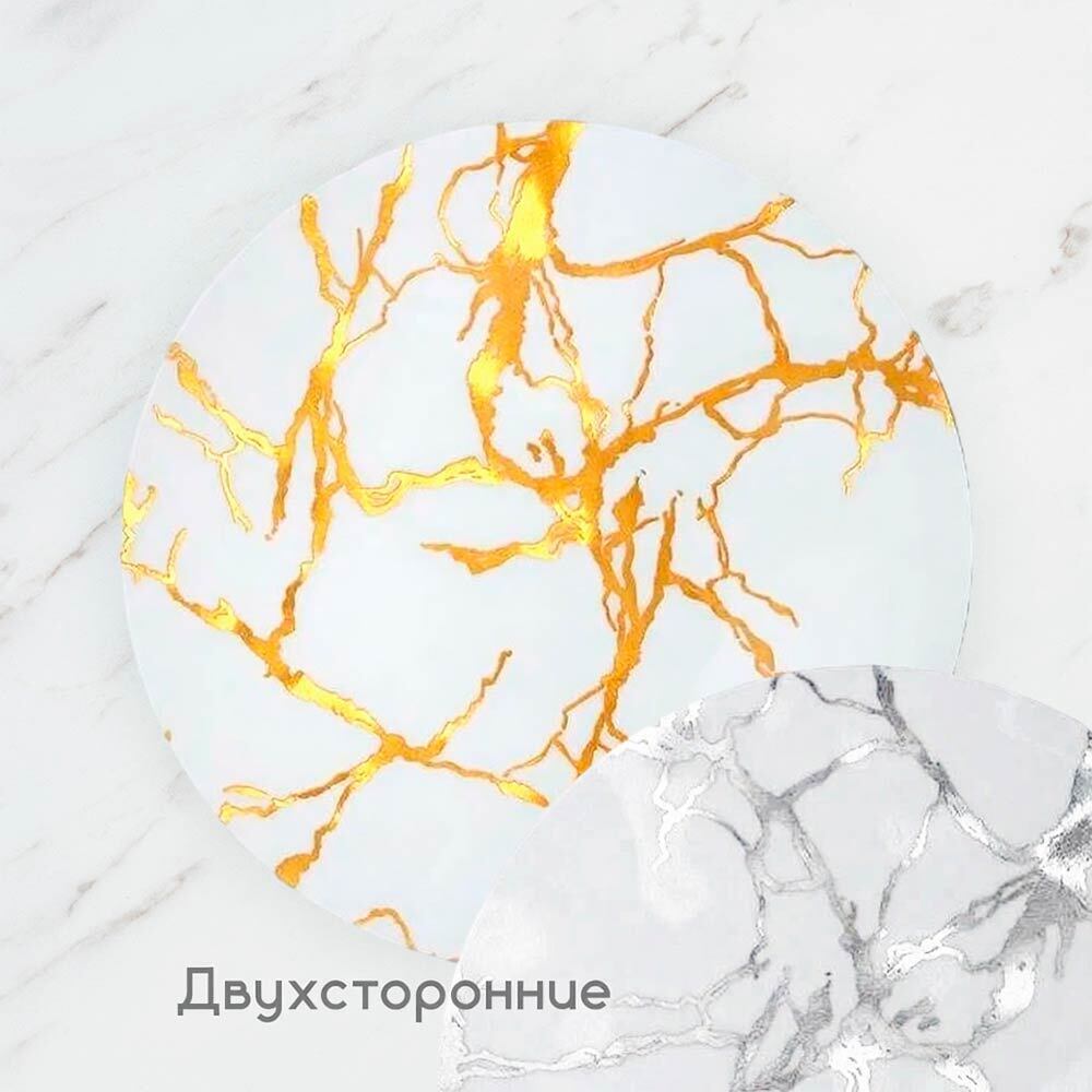 Эта круглая салфетка диаметром 38 см станет стильным и практичным дополнением к вашему столу. Мраморный рисунок с изящными золотыми или серебряными прожилками создаёт эффект элегантной сервировки и идеально подходит как для повседневных ужинов, так и для праздничных застолий. Двусторонний дизайн позволяет легко менять оформление стола, создавая разные визуальные решения без покупки дополнительных аксессуаров.