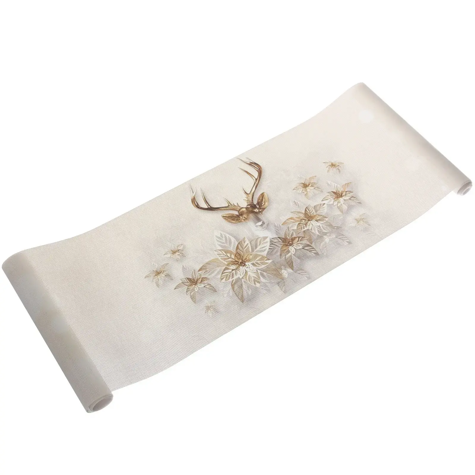 Создайте неповторимую атмосферу зимних праздников с элегантной салфеткой-дорожкой. Роскошный дизайн с золотыми элементами и изящными оленьими рогами станет идеальным завершением вашей праздничной сервировки.