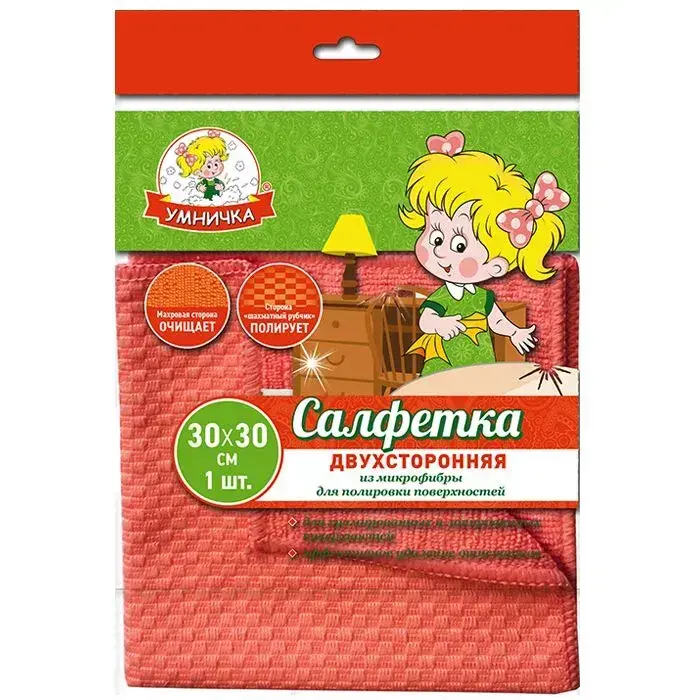 Салфетка двусторонняя Умничка, микрофибра 30х30см, розовая, эффективная уборка и полировка