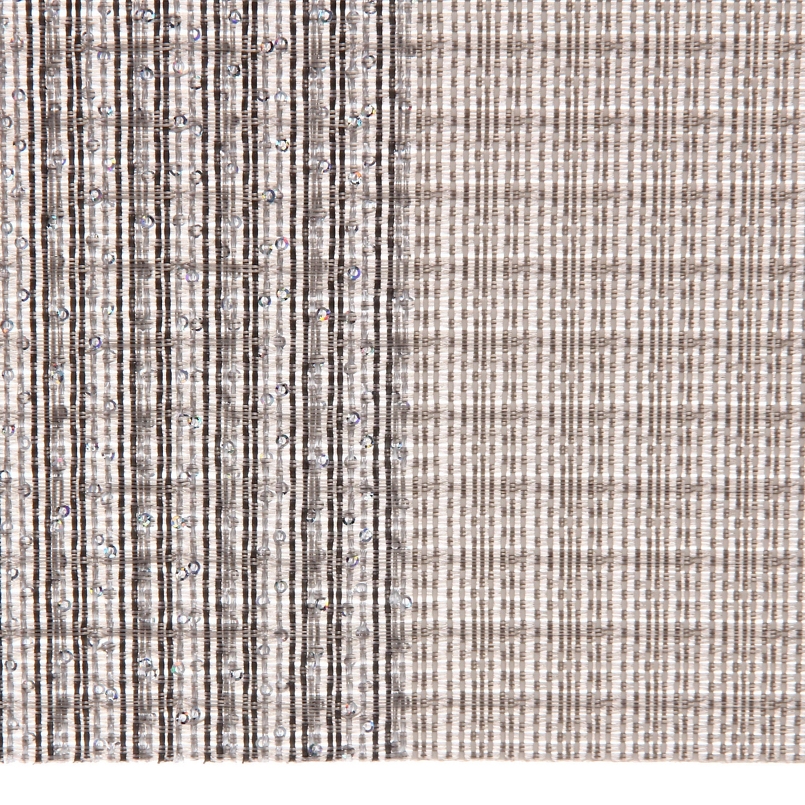 Салфетка отличается уникальным плетеным узором, создающим эффектную текстуру поверхности. Особенностью модели являются блестящие элементы, которые равномерно распределены по поверхности и создают красивые световые блики при освещении. Сочетание коричневых, бежевых и серых оттенков в плетении делает салфетку универсальной для различных цветовых решений интерьера.
