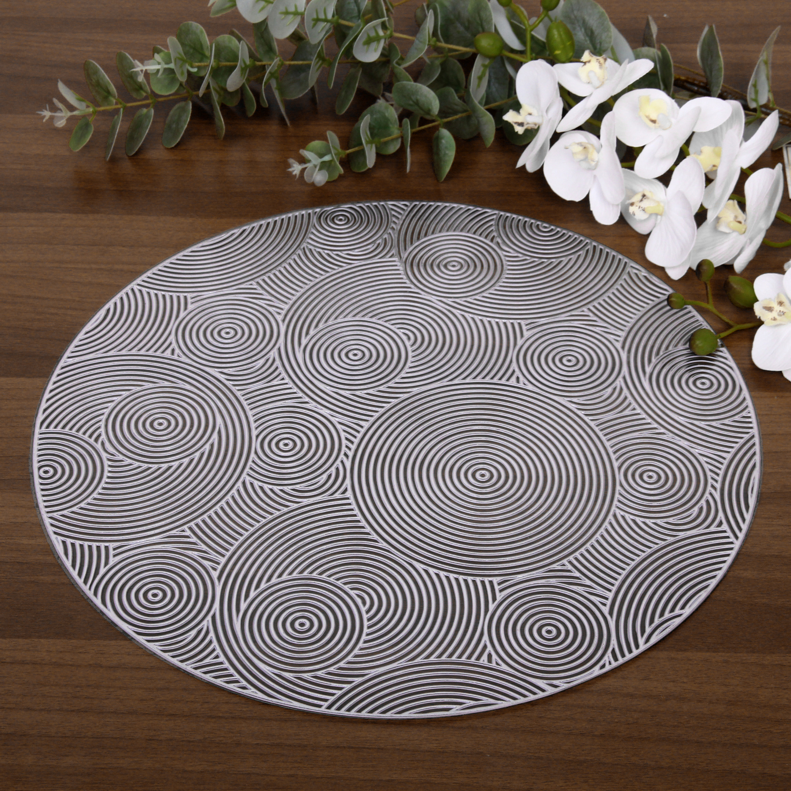 Создайте атмосферу изысканности и уюта на вашей кухне с помощью декоративной салфетки «Бесконечность». Этот стильный аксессуар диаметром 38 см станет идеальным дополнением к любому интерьеру, превращая обычный прием пищи в эстетическое удовольствие. Светло-серый оттенок и уникальный рельефный узор в виде накладывающихся концентрических окружностей придают изделию современный и благородный вид.
