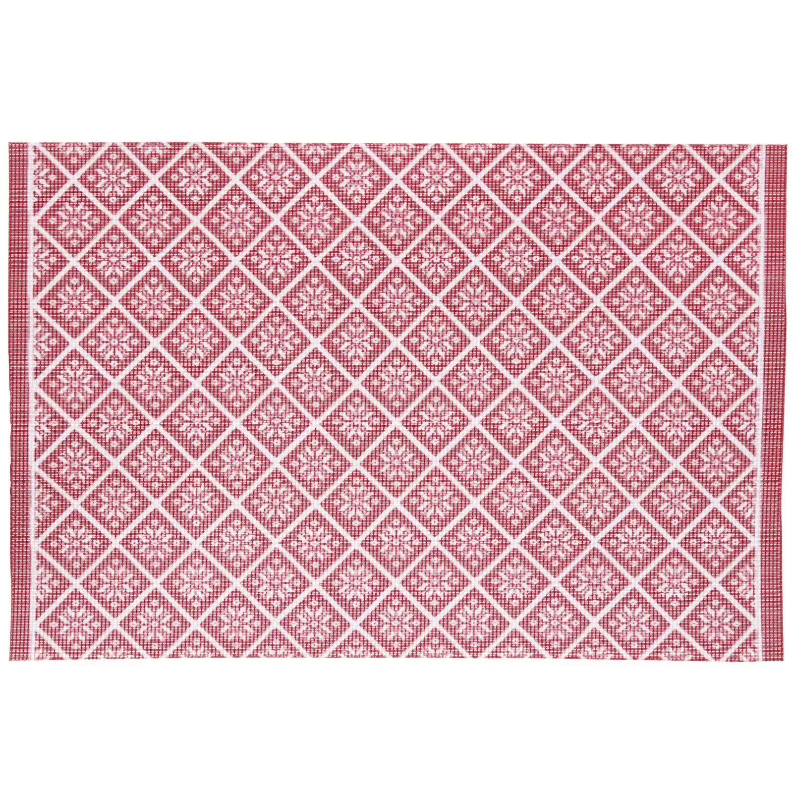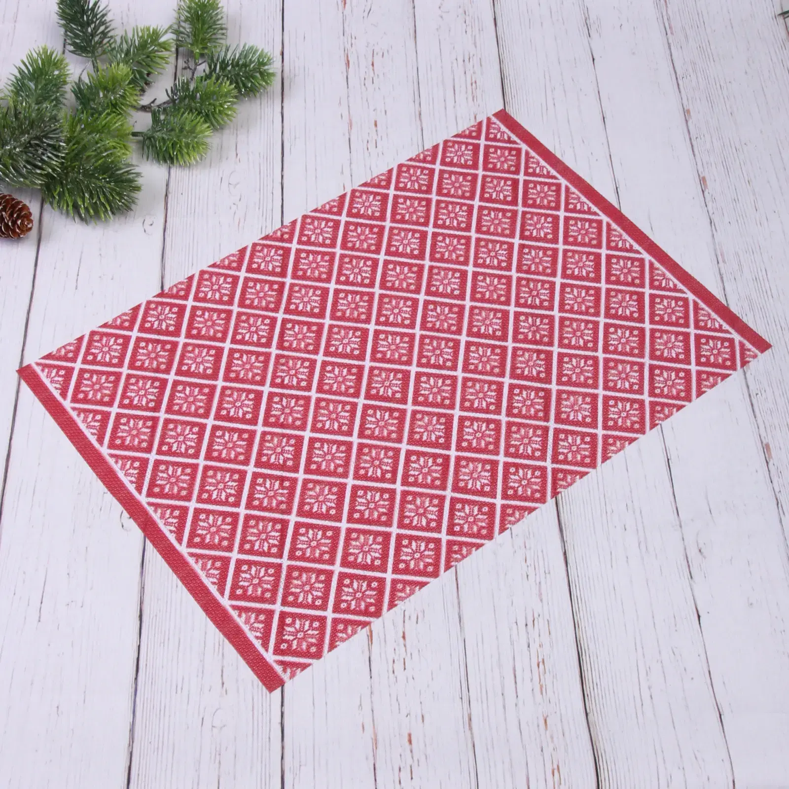 Салфетка имеет прямоугольную форму и размеры 45х30 см, что делает её универсальной для использования. Красный цвет с белыми узорами в виде снежинок и ромбов создает эффектный визуальный акцент. Она легко комбинируется с другими элементами сервировки, такими как скатерти и посуда, позволяя вам создать уникальный стиль вашего стола.