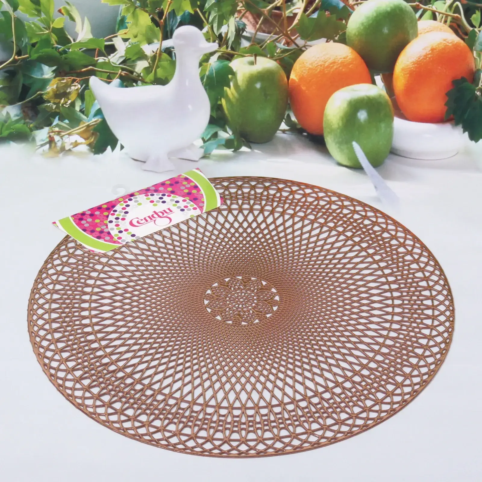 Размер салфетки составляет 38 см в диаметре, что делает её достаточно большой для сервировки различных блюд. Материал ПВХ обеспечивает долговечность и легкость в уходе. Салфетка имеет сетчатую структуру, что придаёт ей лёгкость и изящество. Добавьте нотку стиля в ваш дом с помощью этой уникальной салфетки!