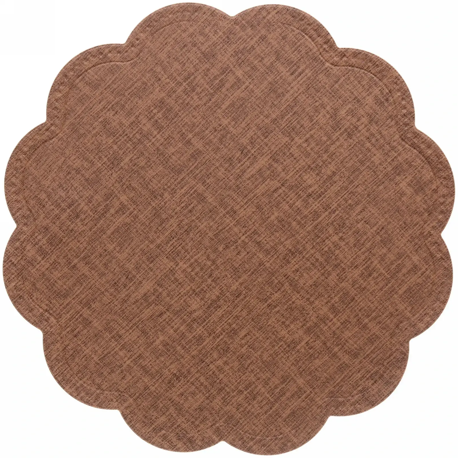 Размер салфетки составляет 38 см в диаметре, что делает её идеальной для большинства столов. Коричневый цвет легко сочетается с различными оттенками и стилями, а плетеная текстура добавляет интересный визуальный элемент. Салфетка выполнена из качественного ПВХ, что обеспечивает её долговечность и простоту в уходе.
