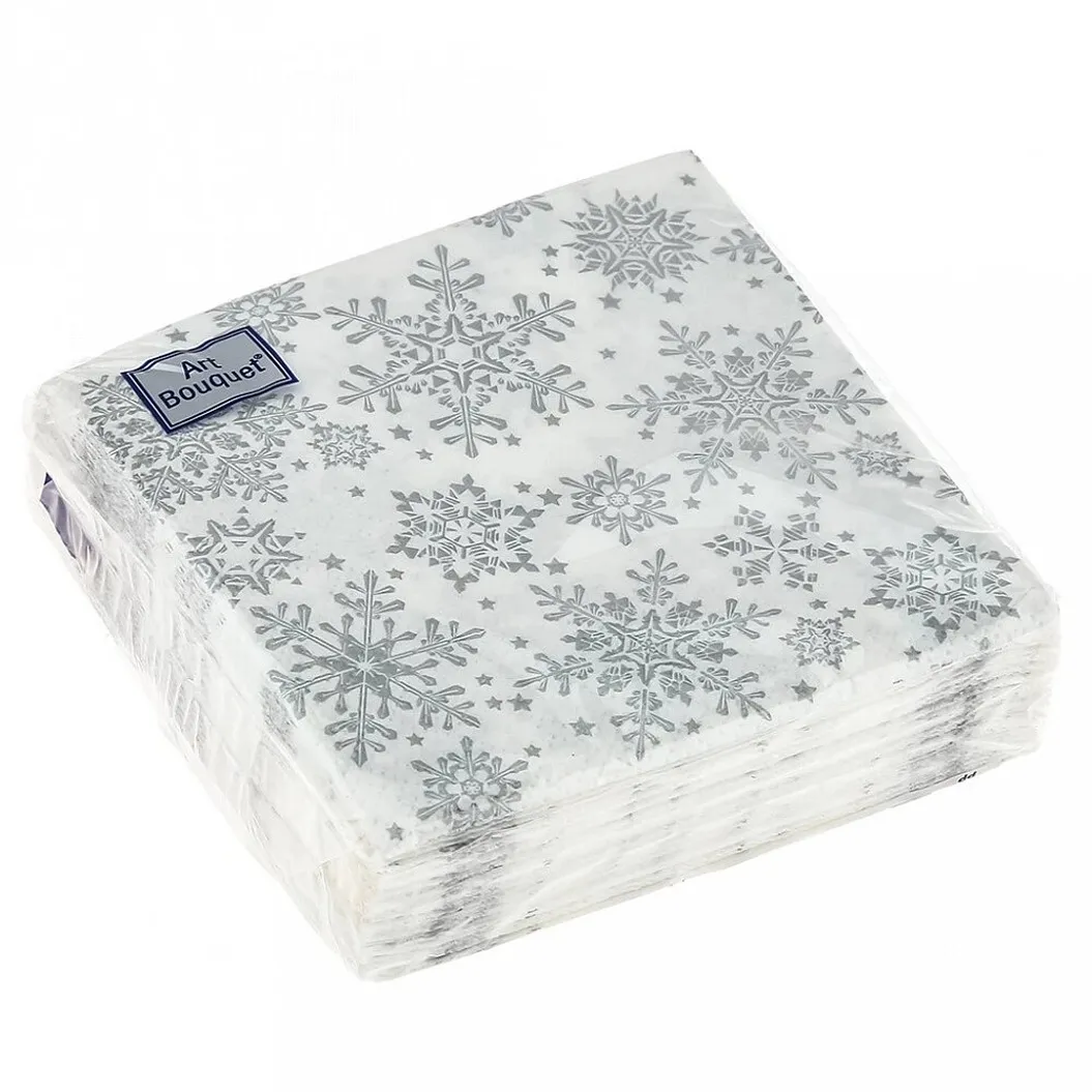 Создайте атмосферу зимней сказки и уюта на своем праздничном столе с этими красивыми бумажными салфетками. Нежный рисунок серебристых снежинок на белоснежном фоне идеально подходит для новогодних и рождественских торжеств, семейных обедов и ужинов, а также для оформления кофейных столиков и сервировки десертов.