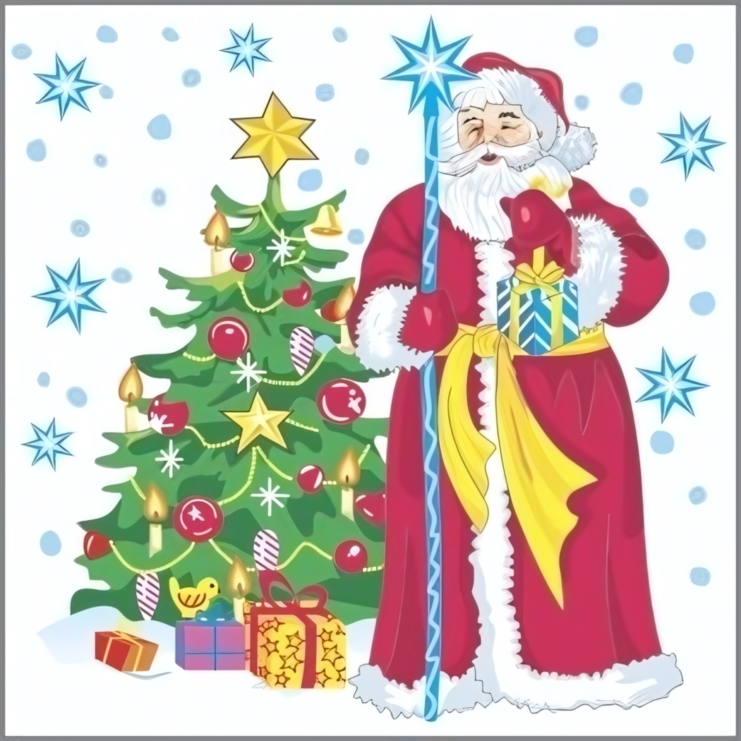 Салфетки размером 24х24 см идеально подходят для сервировки стола на Новый год и Рождество. Они могут использоваться как для повседневных, так и для торжественных случаев. Благодаря своему дизайну с изображением Деда Мороза и рождественской ёлки, они создадут уютную и праздничную атмосферу.
