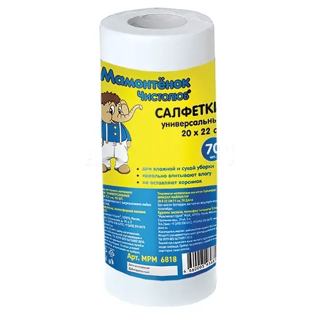 Салфетки универсальные «Мамонтенок чистолюб» 20х22см, 70шт/рулон, вискозные, без ворсинок