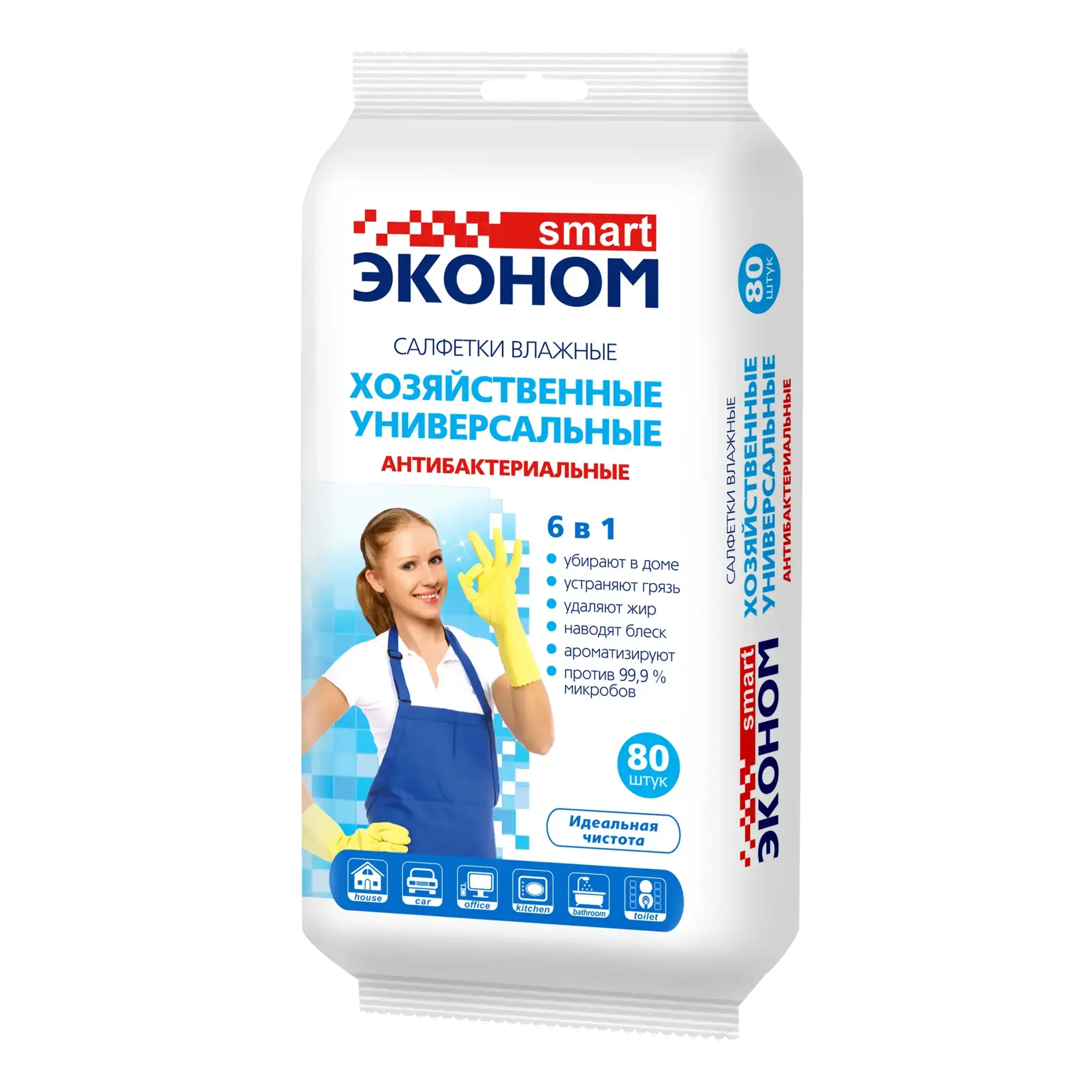 Салфетки влажные SMART Эконом — это ваш надежный помощник в поддержании чистоты и порядка. Эти антибактериальные универсальные салфетки с 6 функциями в одном обеспечивают идеальную чистоту, устраняя грязь, жир и неприятные запахи. Они защищают от 99,9% микробов, что делает их незаменимыми в каждом доме.
