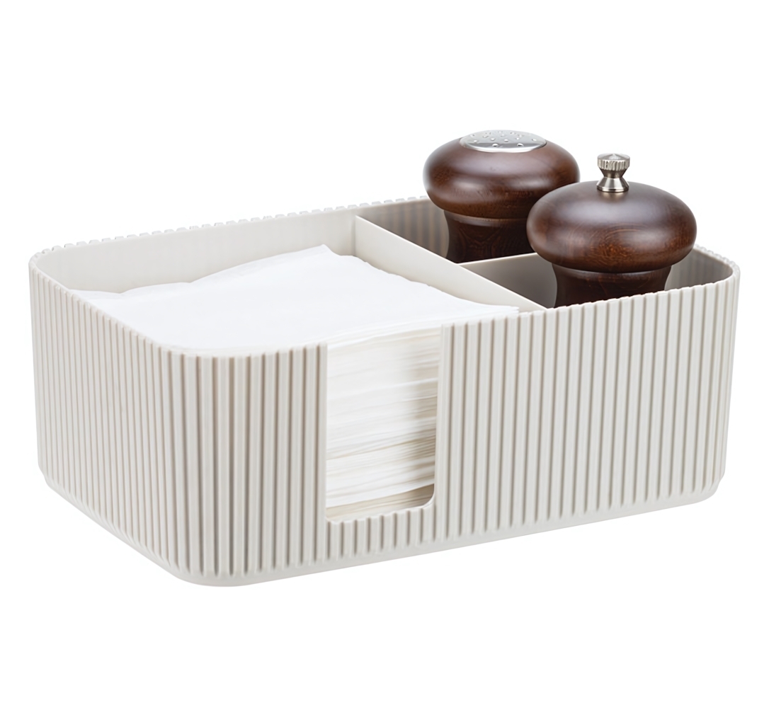 Кремовый цвет и рифленая текстура создают неповторимый внешний вид, а компактные размеры (22х14.5х8см) позволяют разместить салфетницу даже на небольшой поверхности. Используйте дополнительные секции для хранения солонки, чайных пакетиков или специй – всё будет под рукой.
