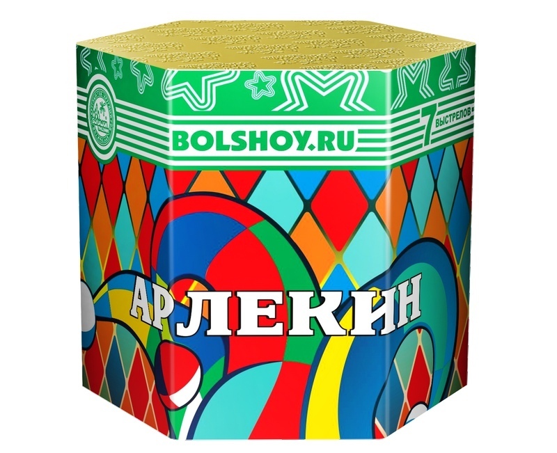 Салют батарея Арлекин имеет уникальную упаковку шестигранной формы, украшенную геометрическими узорами в красном, зеленом, синем и желтом цветах. На лицевой стороне упаковки крупным шрифтом написано слово «АРЛЕКИН», а золотистая крышка с рельефными рисунками добавляет элегантности. Не упустите возможность сделать ваш праздник по-настоящему ярким и запоминающимся!