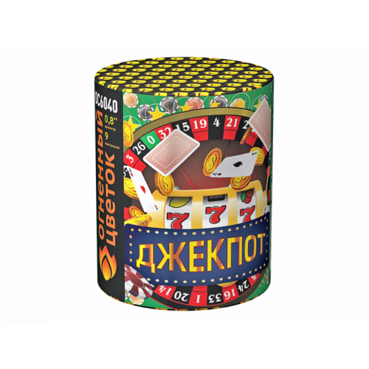 Салют упакован в цилиндрическую коробку, украшенную графическими элементами, связанными с азартными играми, такими как карты и фишки. Цветовая гамма упаковки включает черный, желтый, красный и зеленый цвета, что делает его привлекательным для глаз. Размеры изделия: диаметр 0,8 дюйма, количество в упаковке — 9 штук. Подарите себе и своим близким яркие эмоции с салютом «Джекпот»!