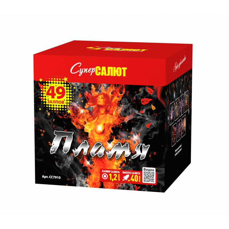 Салют имеет калибр снаряда 1,2 дюйма, что обеспечивает мощный и яркий эффект. Упаковка выполнена в форме куба, с красным цветом и графическими изображениями, что делает его привлекательным и заметным. Не упустите возможность сделать ваш праздник незабываемым с салютом «Пламя»!