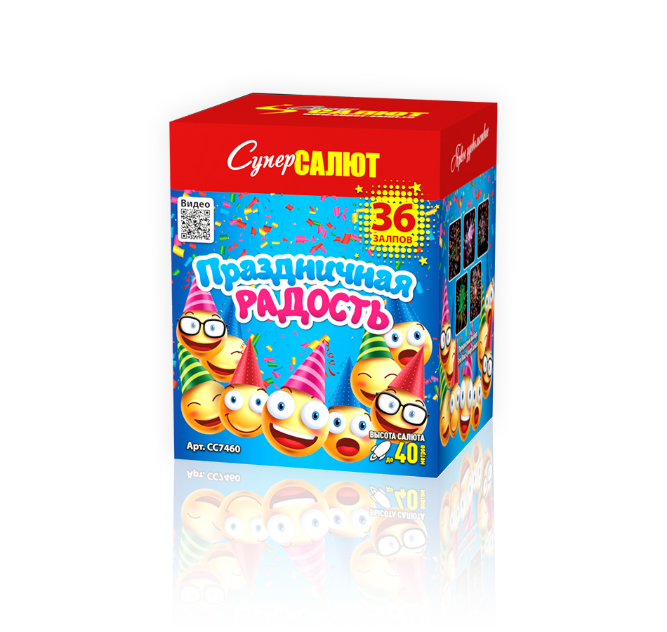Салют «Праздничная радость» имеет прямоугольную упаковку, что облегчает его транспортировку и хранение. На упаковке также присутствует QR-код для получения дополнительной информации. Не упустите возможность сделать ваш праздник незабываемым с этим великолепным фейерверком!