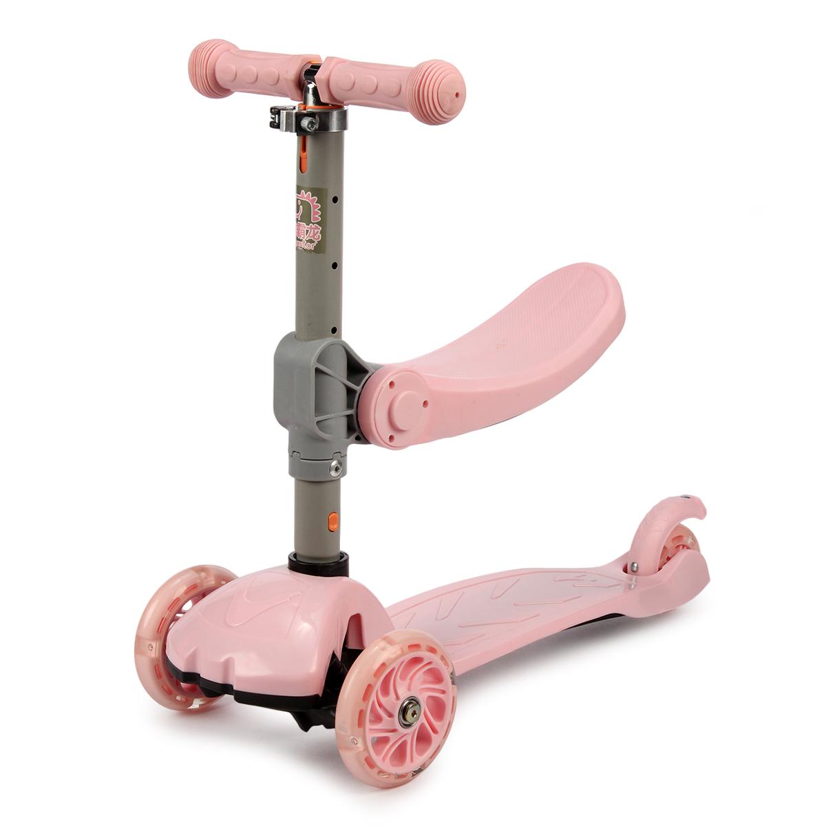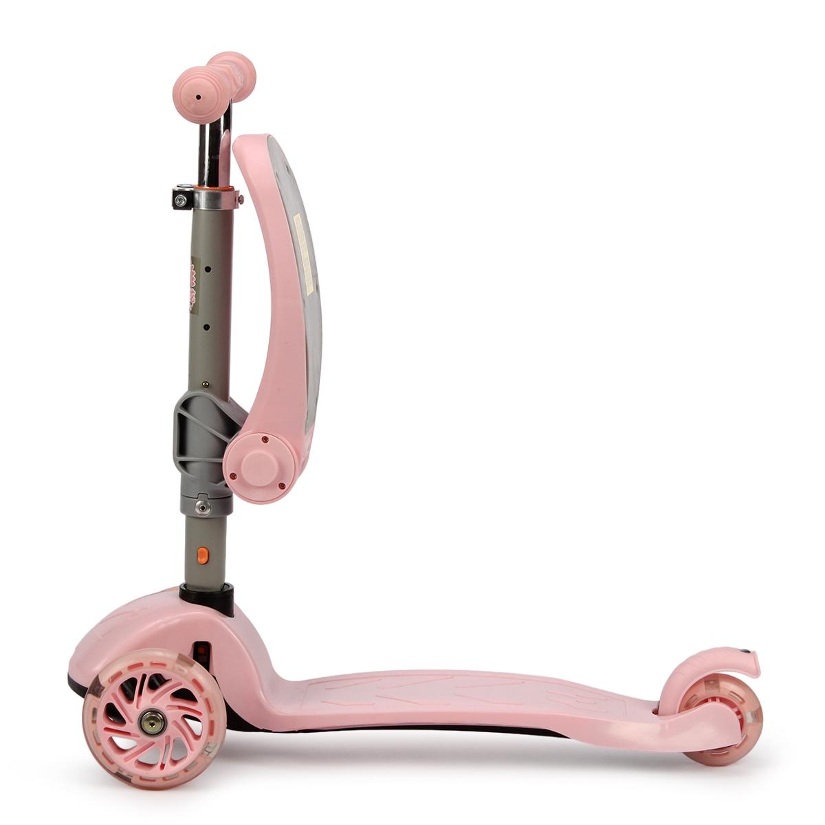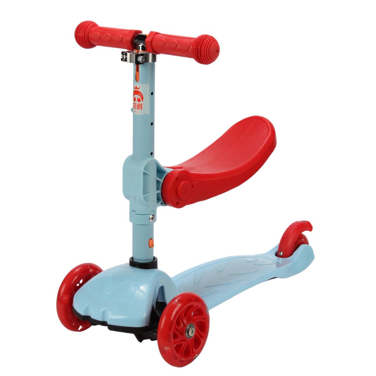 Благодаря широкой базе из трех колес обеспечивается максимальная устойчивость. Материал PU гарантирует долговечность колес и комфортную езду. Съемное сиденье позволяет использовать самокат как классический вариант без сидячего положения.