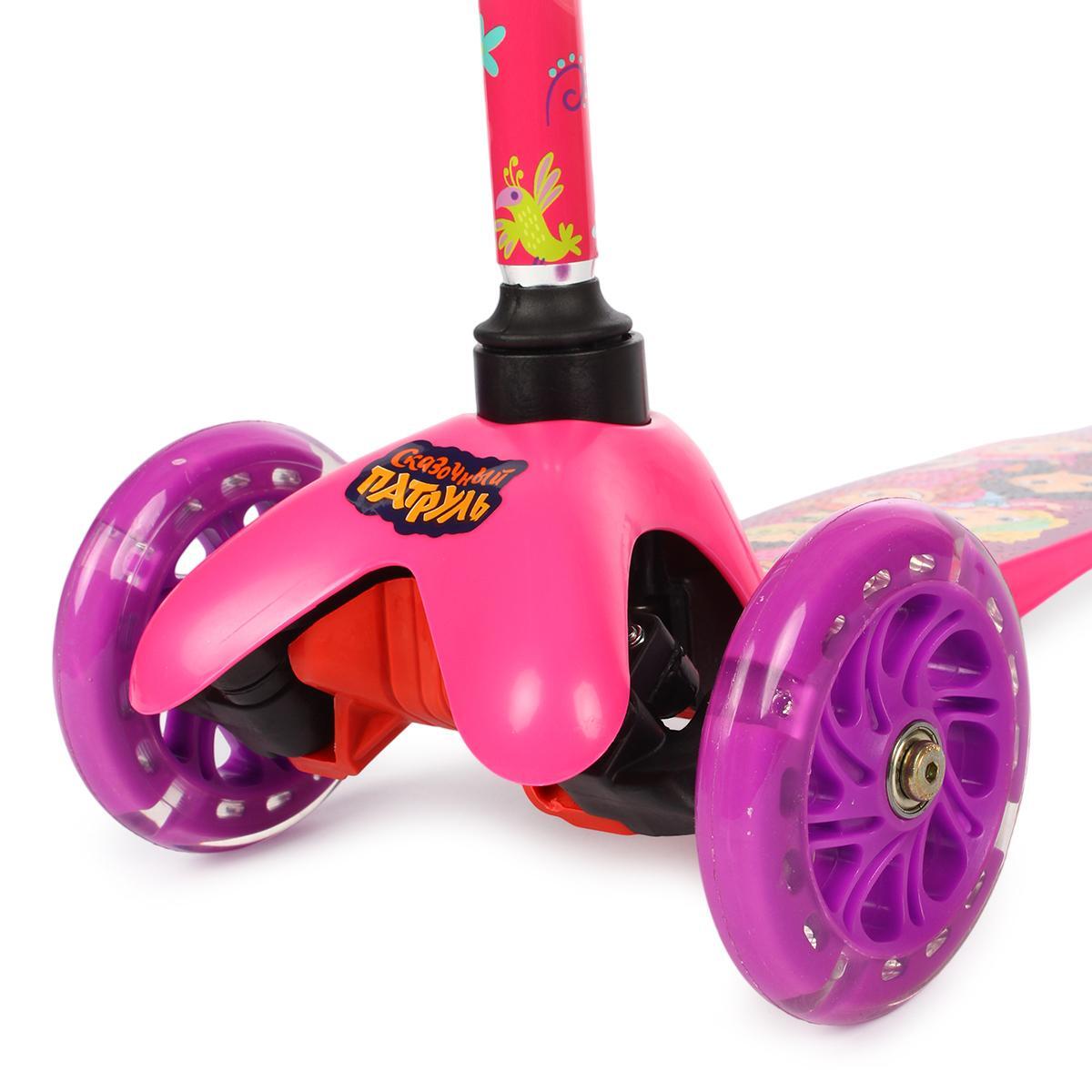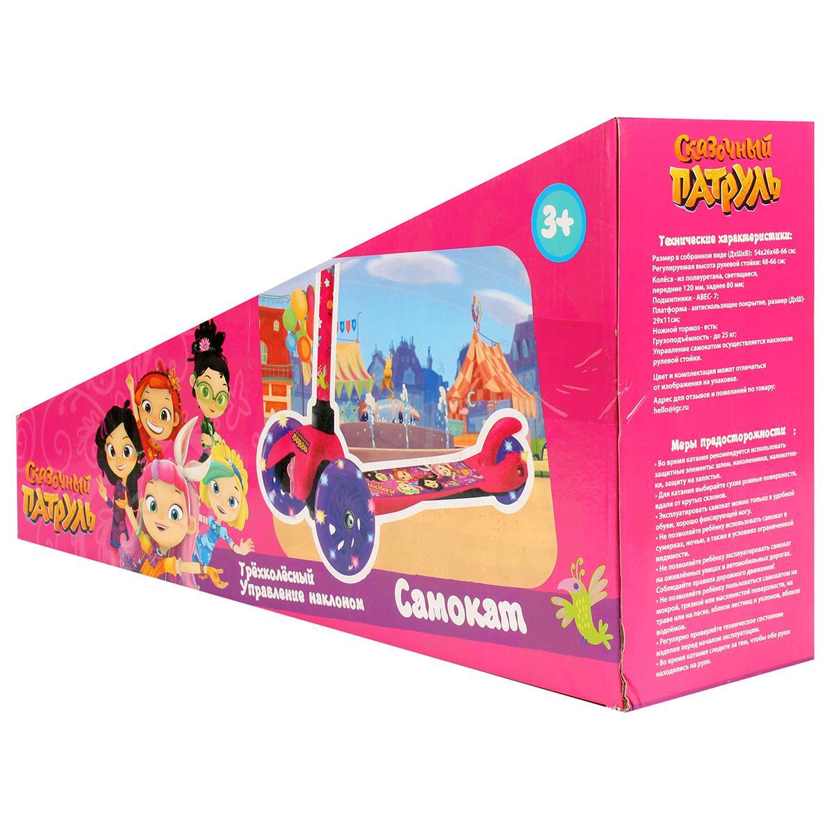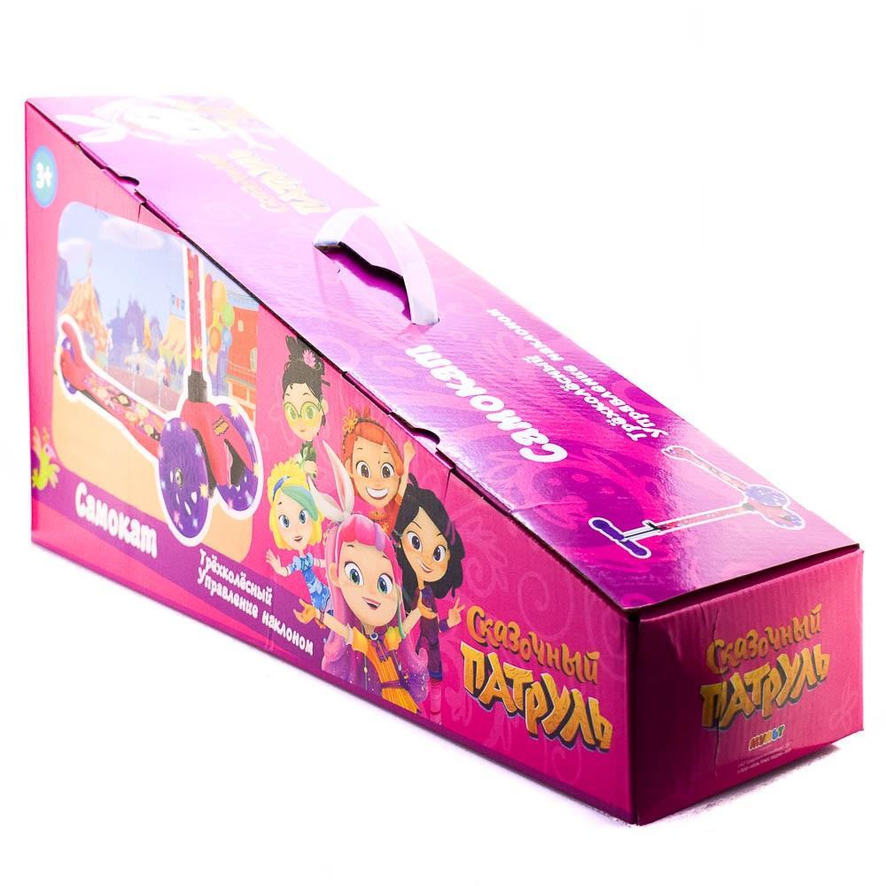 - Яркий дизайн: Розовый цвет, фиолетовые детали и изображения персонажей "Сказочного патруля" делают самокат привлекательным для детей.