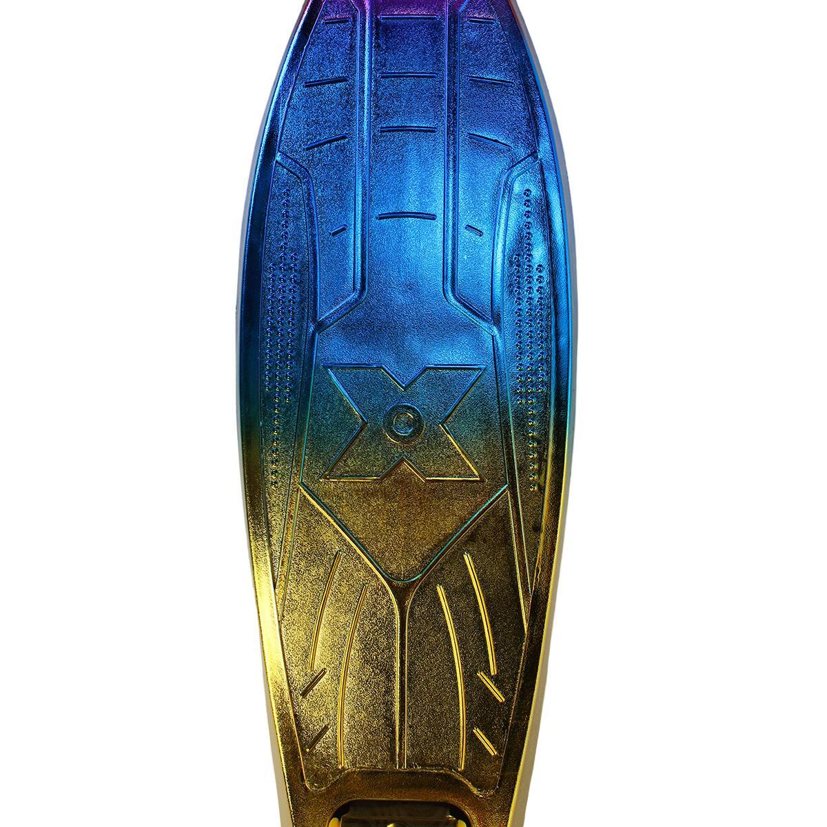 Прочная пластиковая дека с антискользящим покрытием выдерживает нагрузку до 60 кг. Складной механизм и компактные размеры 55×30×87 см позволяют легко хранить и транспортировать самокат. Градиентный дизайн платформы и неоновые акценты делают его стильным аксессуаром для прогулок.