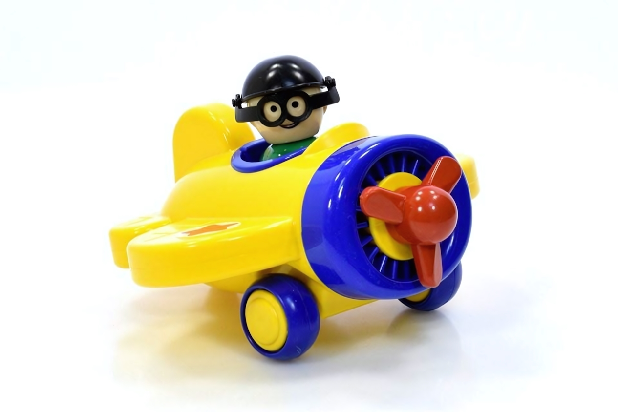 - Инерционный механизм — тяжёлые колёса из ПВХ обеспечивают плавное движение самолёта после небольшого толчка, развивая у ребёнка координацию и моторику