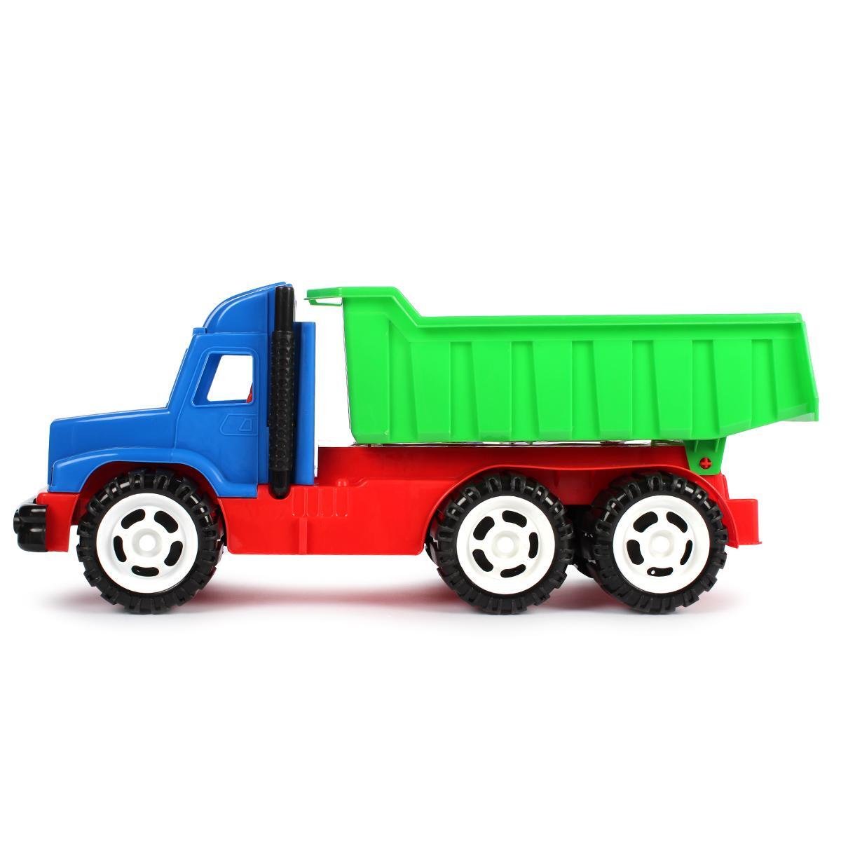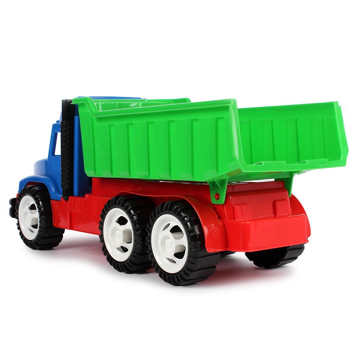 Материал: пластик. Цветовая гамма: синяя кабина, красная рама, зелёный самосвальный контейнер. Игрушка выполнена без движущихся механизмов, что делает ее безопасной для раннего возраста и удобной для совместной игры с воспитателями и родителями. Размеры и точная комплектация не указаны, однако изделие удобно держать в детской руке и использовать в песке, на ковре или в игровой зоне.