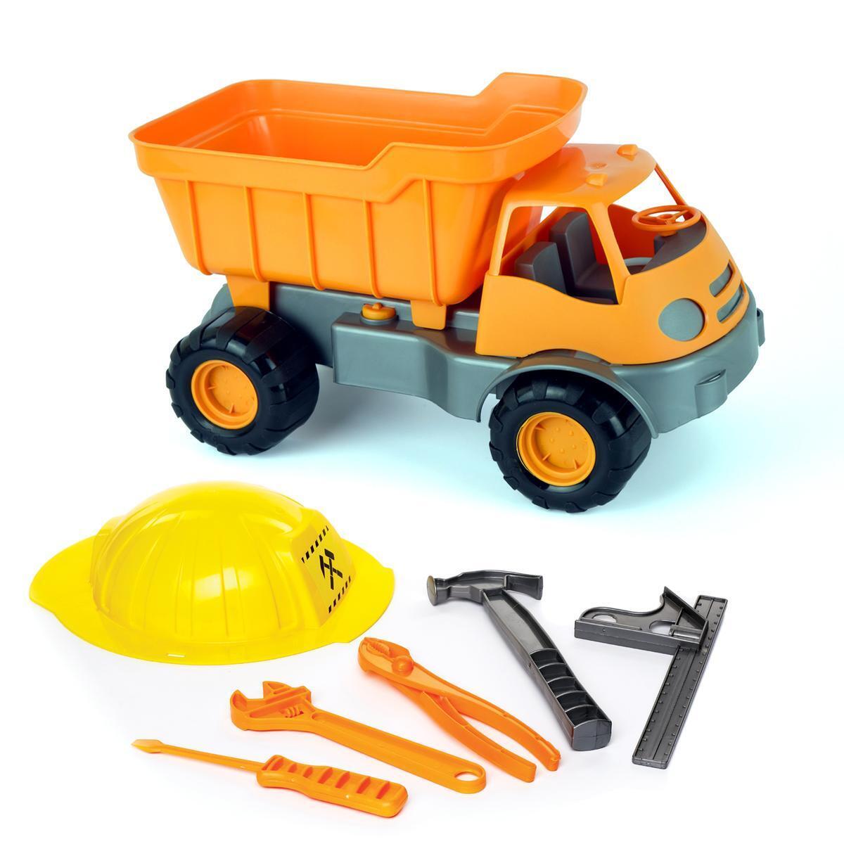 Самосвал предназначен для детей, которые любят играть с транспортом и строить. Он идеально подходит для игры как на улице, так и в помещении. Все элементы машинки имеют увеличенные размеры, что удобно для маленьких ручек ребенка. В комплекте с самосвалом идет жёлтая каска и набор пластиковых инструментов, включая молоток, гаечный ключ, плоскую отвертку, трёхгранник и линейку, выполненные в ярком оранжевом цвете.