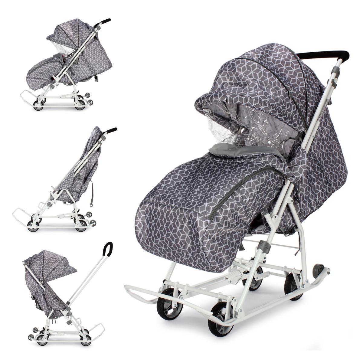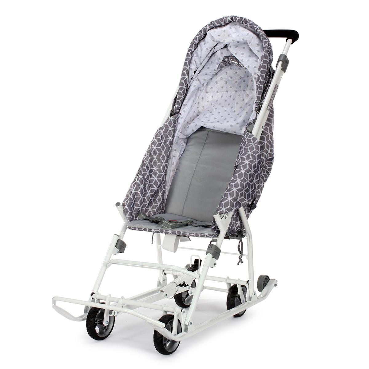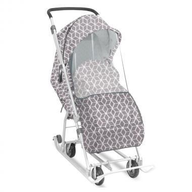 Санки предназначены для детей от 1 года и обладают широкими возможностями использования. Перекидная ручка-толкатель управляет движением как к себе, так и от себя, что делает передвижение более удобным. Складной козырёк и защитный тент от ветра обеспечат комфортные условия для вашего малыша вне зависимости от погоды.