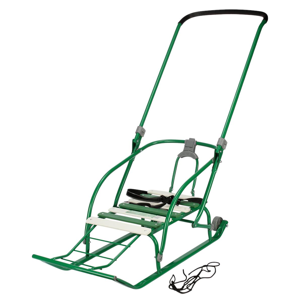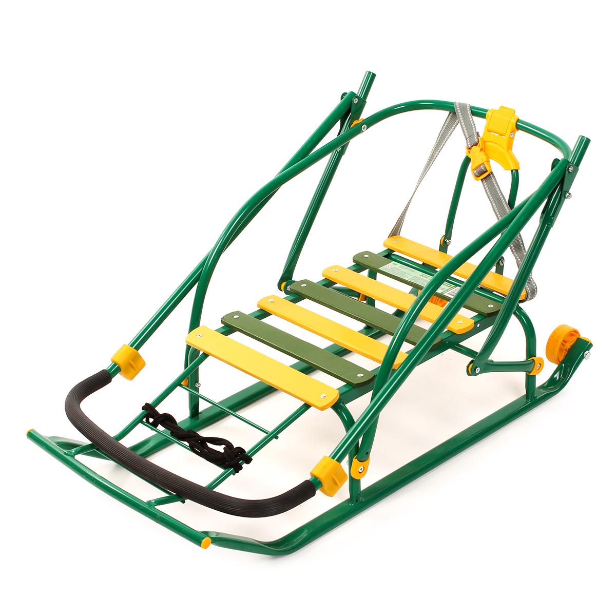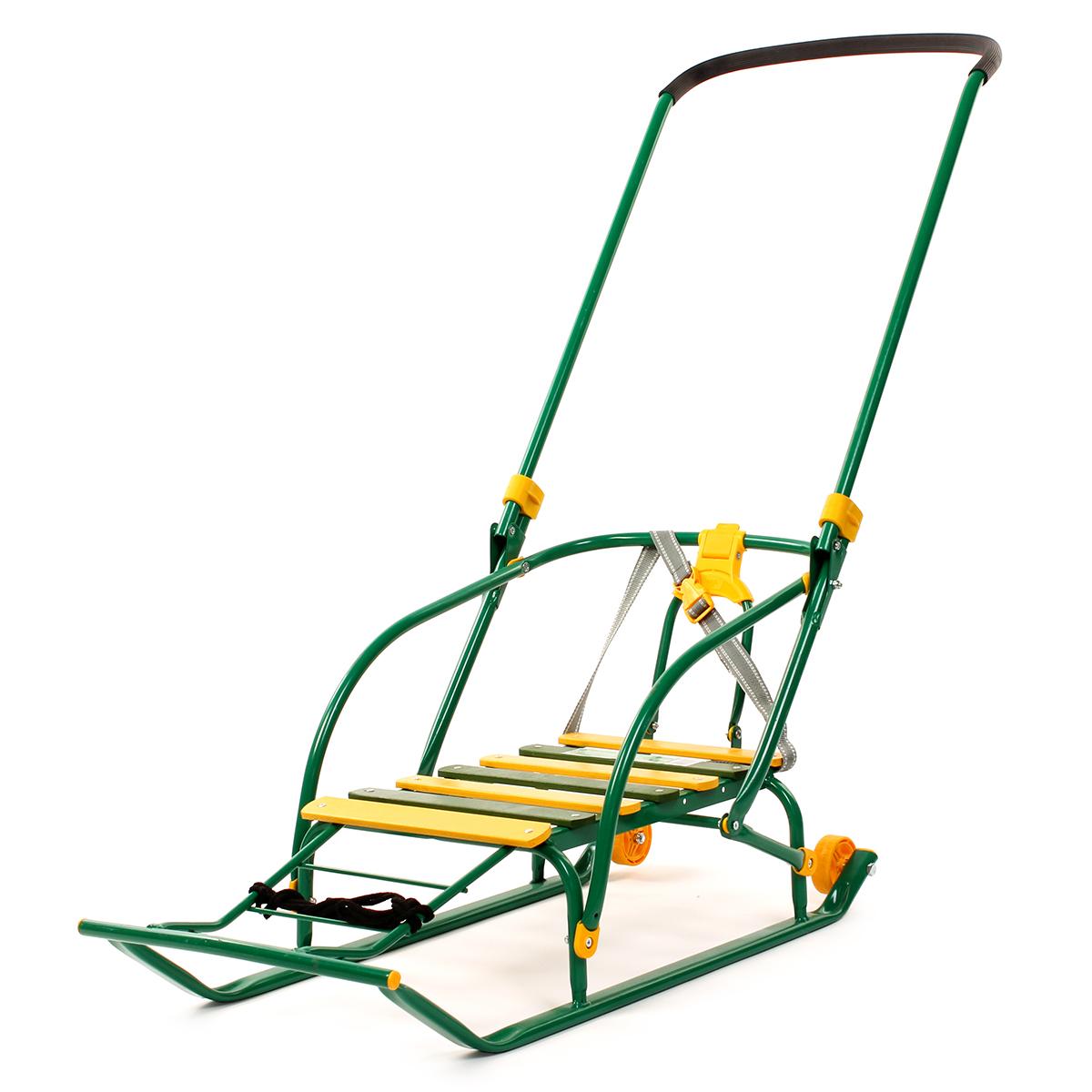 Рекомендуются для малышей до 25 кг. Можно использовать как зимнее транспортное средство, катая за собой или за ребёнком, благодаря складной ручке-толкателю и небольшой весу. Прочная конструкция с металлическим каркасом, утеплённым сиденьем и ремнём безопасности обеспечивает безопасность малыша.
