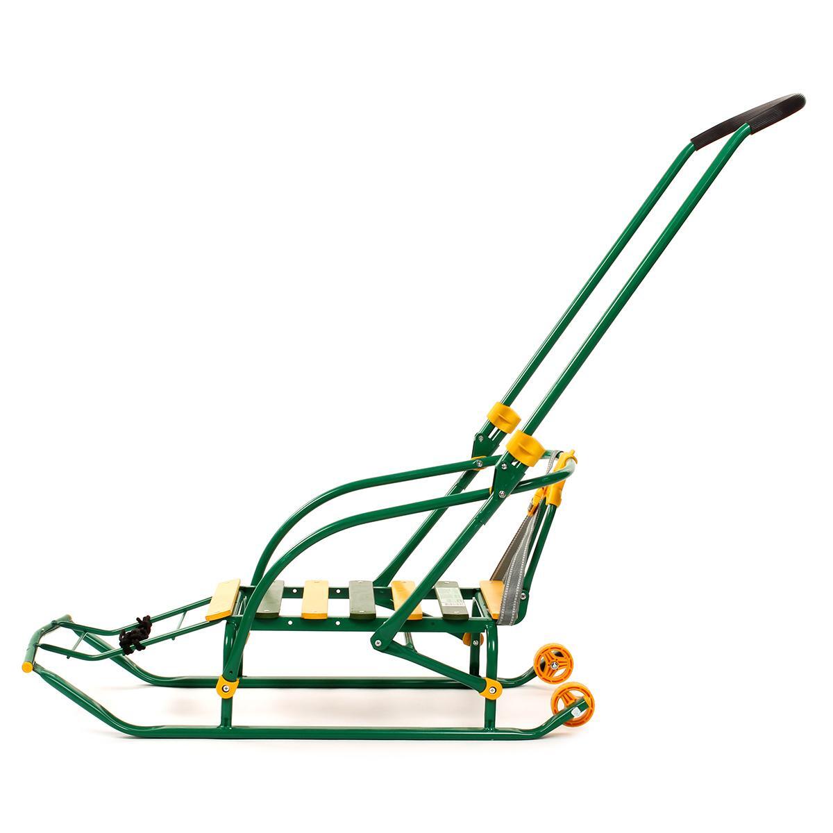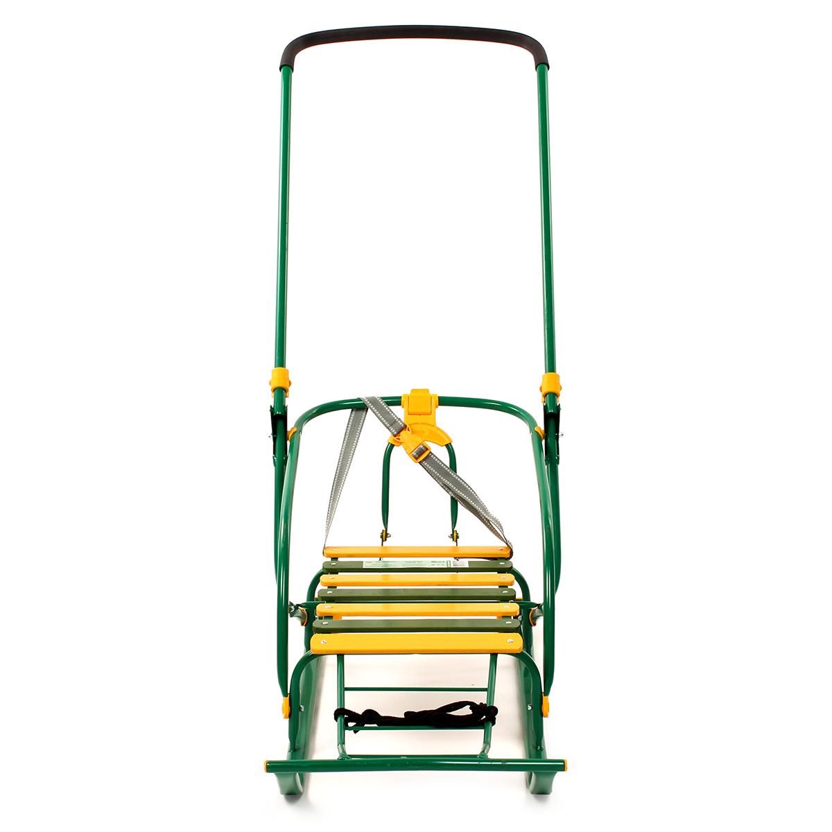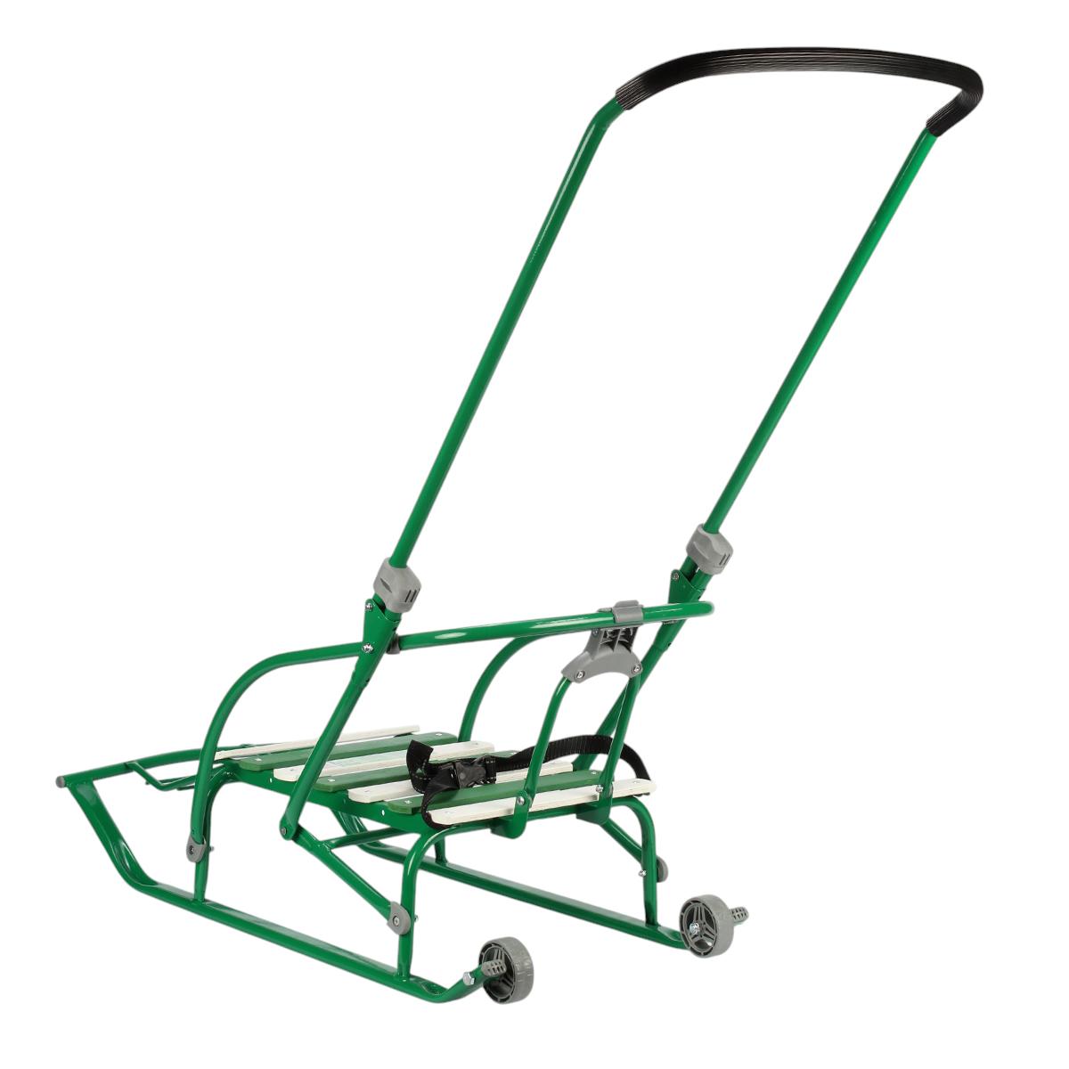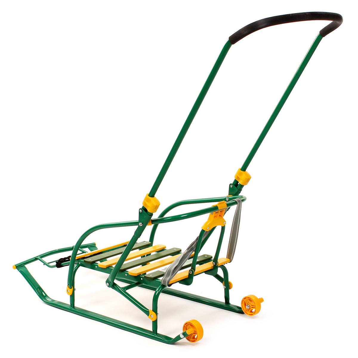 Рекомендуются для малышей до 25 кг. Можно использовать как зимнее транспортное средство, катая за собой или за ребёнком, благодаря складной ручке-толкателю и небольшой весу. Прочная конструкция с металлическим каркасом, утеплённым сиденьем и ремнём безопасности обеспечивает безопасность малыша.