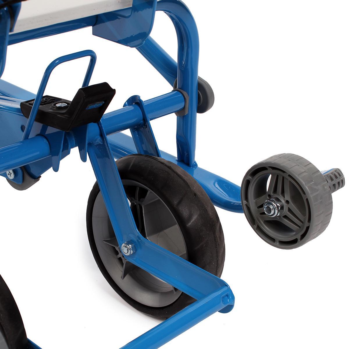 Эргономичная ручка-толкатель с регулируемой высотой (18/24 см) подстраивается под рост взрослого. Специальные отверстия в раме обеспечивают надёжную фиксацию страховочного шнура. Ударопрочный пластик и порошковая окраска сохраняют презентабельный вид после многолетней эксплуатации.