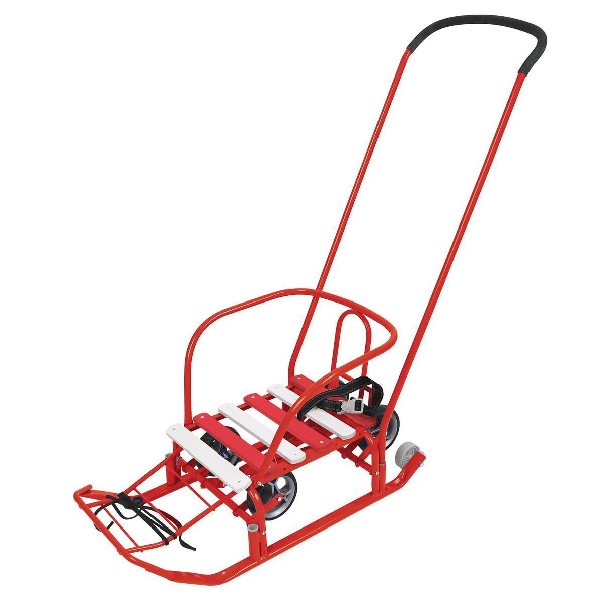 Санки оснащены выдвижной системой колесных шасси с механизмом фиксации, что позволяет легко переключаться между катанием по снегу и передвижением по асфальту или в помещении. Высокая ручка-толкатель и ремень безопасности обеспечивают безопасность и комфорт для ребенка и родителя. Колеса на полозьях обеспечивают плавное скольжение по снегу, а складная ручка — компактное хранение и транспортировка.