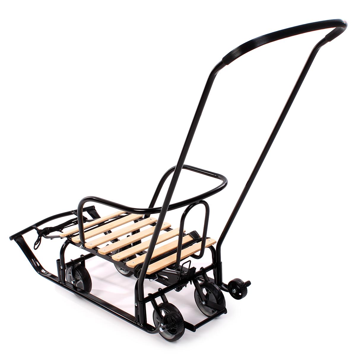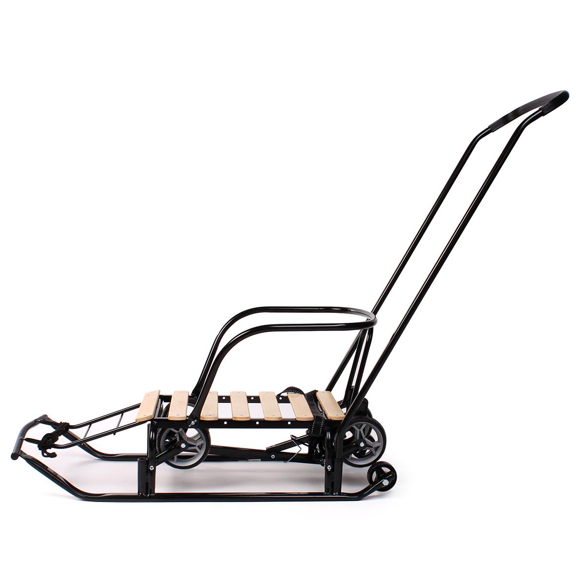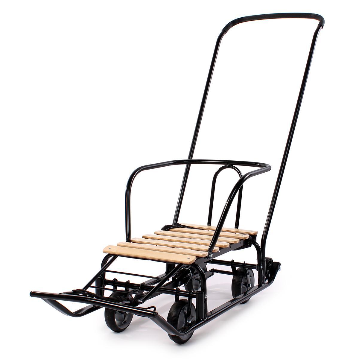 Изготавливаются из прочного и надёжного металлического каркаса с антикоррозийным покрытием, что обеспечивает долгий срок службы без проблем. Сиденье из натуральных деревянных реек создает удобство и стильный вид, а также обеспечивает безопасность благодаря дополнительным ограждениям и ремню. Механизм выдвижных колёс позволяет легко переключаться с полозьев на колёса, что делает санки многофункциональными.