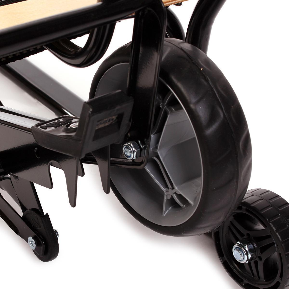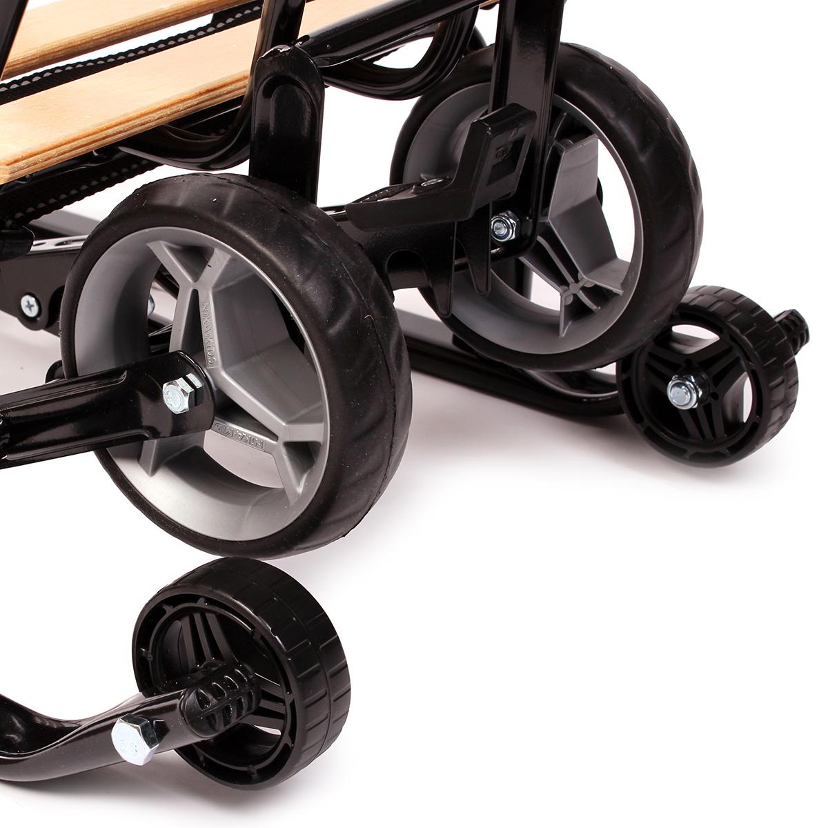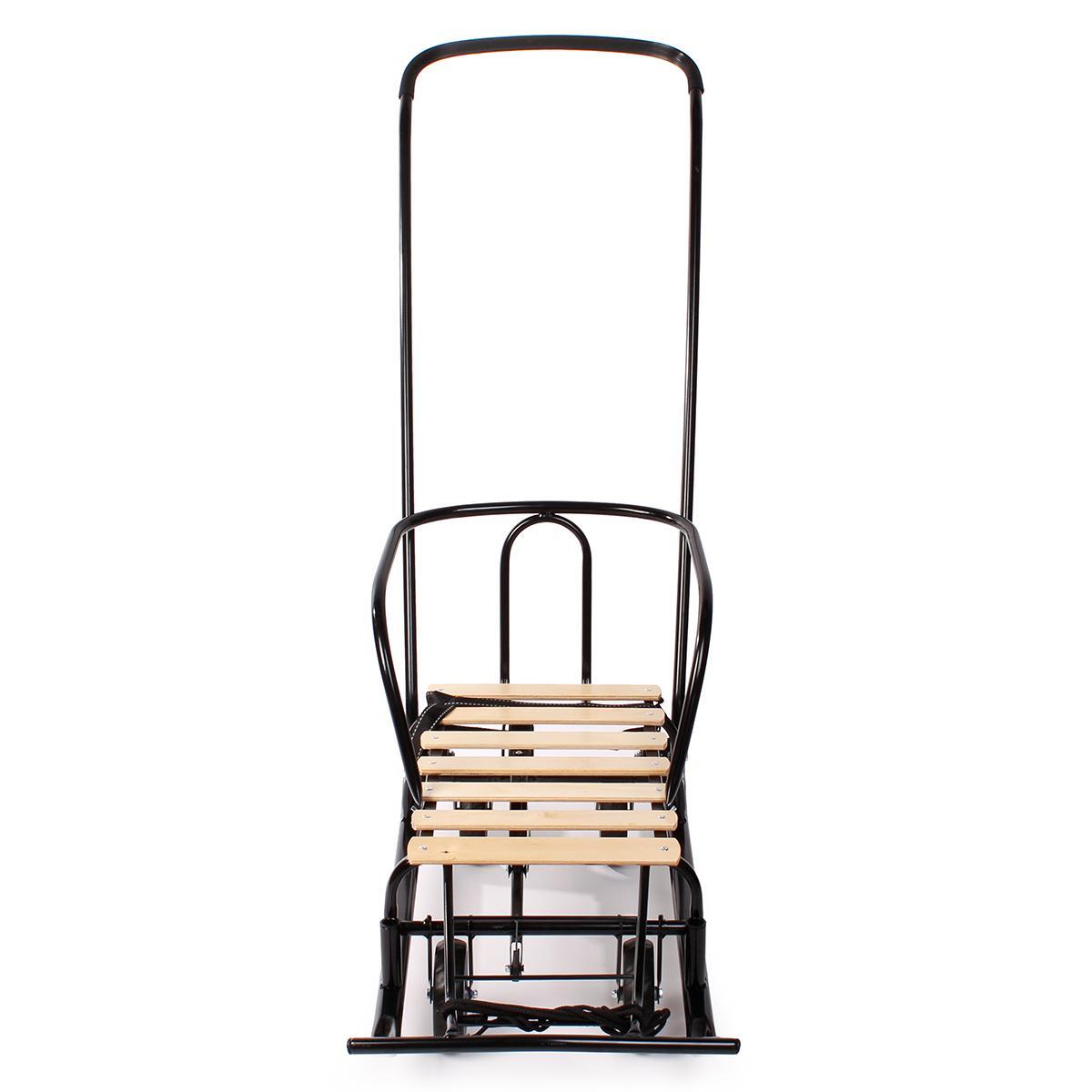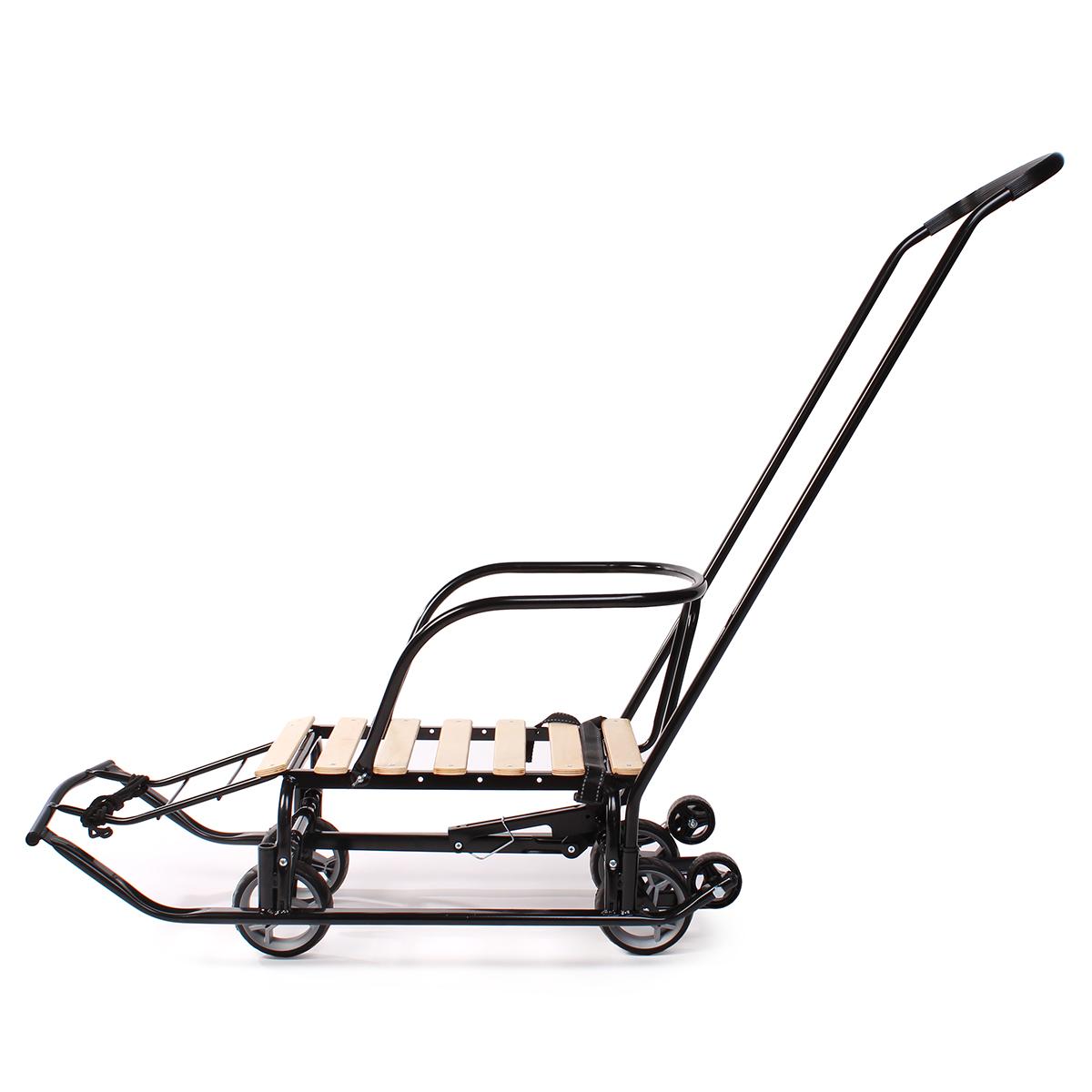 Изготавливаются из прочного и надёжного металлического каркаса с антикоррозийным покрытием, что обеспечивает долгий срок службы без проблем. Сиденье из натуральных деревянных реек создает удобство и стильный вид, а также обеспечивает безопасность благодаря дополнительным ограждениям и ремню. Механизм выдвижных колёс позволяет легко переключаться с полозьев на колёса, что делает санки многофункциональными.