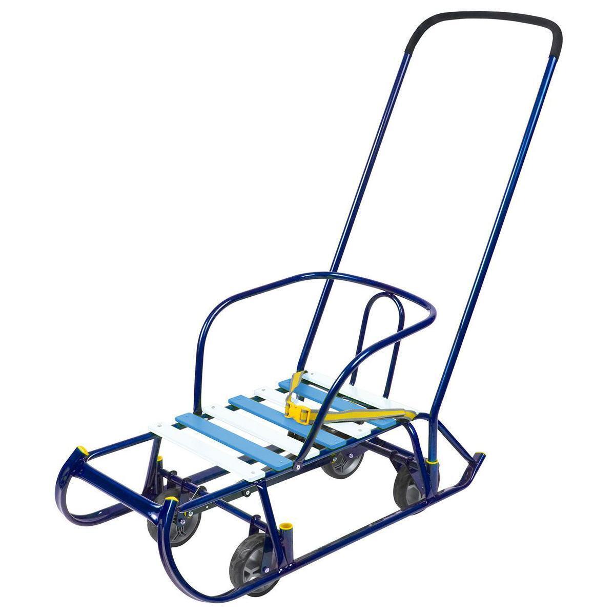 Основные преимущества — металлический каркас с антикоррозийным покрытием, прочное сиденье из рейки и дополнительные функции, такие как ручка-толкатель и ремень безопасности. Колеса, которые переключаются между полозьями и колесами, позволяют легко проходить по снегу, асфальту и в помещениях.