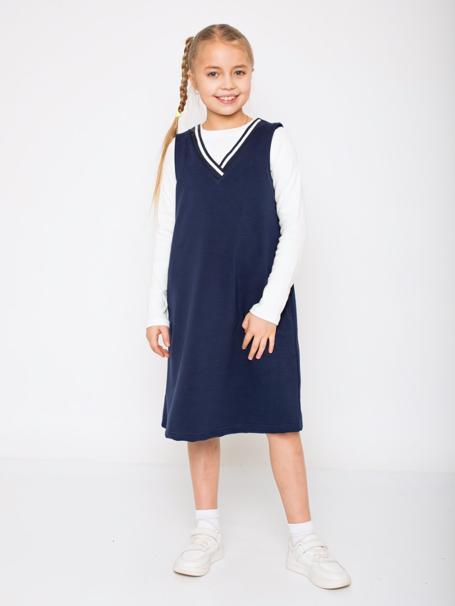 Идеальный баланс практичности и стиля для девочек: мягкая ткань с добавлением хлопка обеспечивает комфорт в течение всего учебного дня. V-образный вырез и А-силуэт создают аккуратный вид, подчёркивая детскую фигуру.