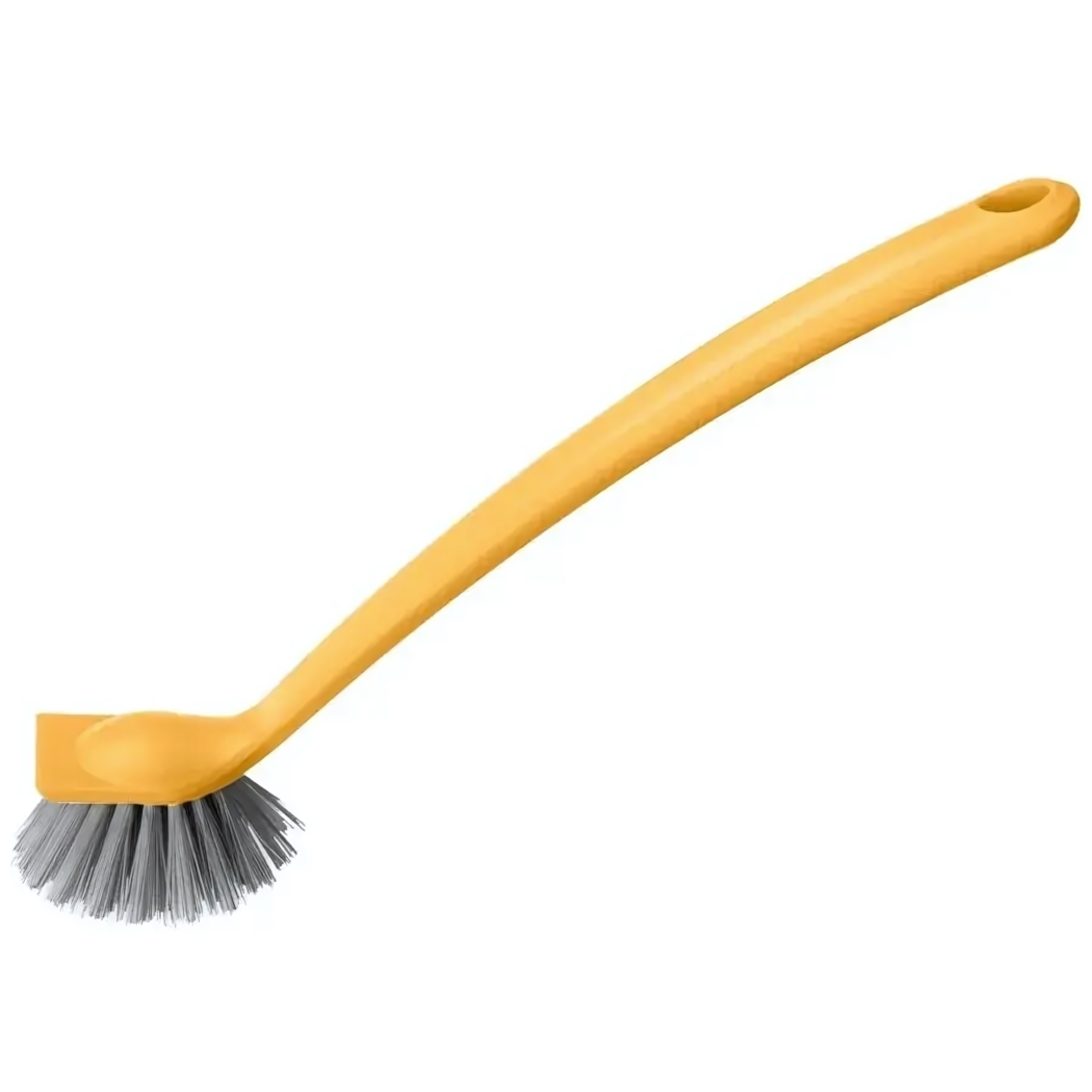 Цветная ручка из ударопрочного пластика обеспечивает надежный хват. Плотная щетина серого цвета не царапает поверхность посуды.