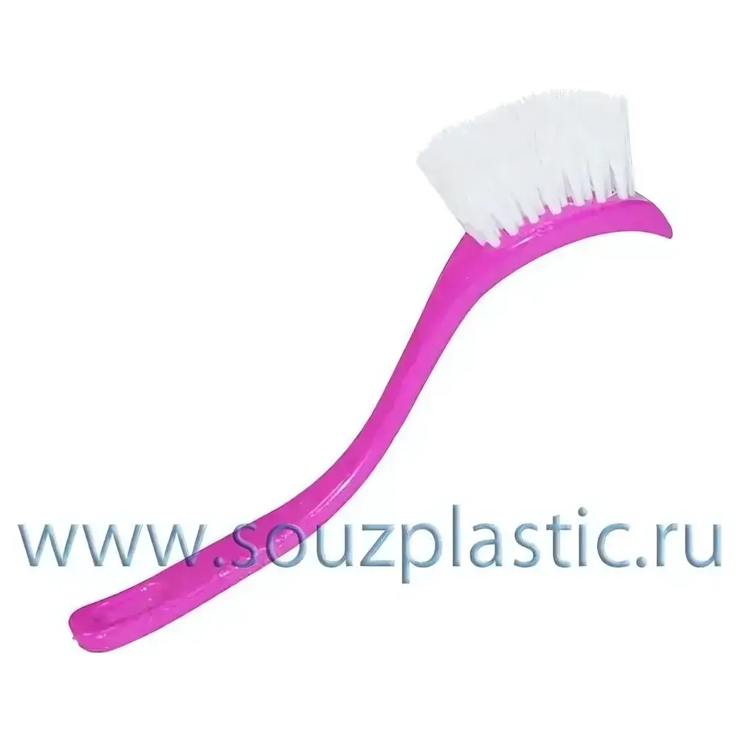 Щетка изготовлена из прочного пластика насыщенного розового цвета, дополненного белыми синтетическими щетинками высокой плотности. Отсутствие металлических элементов исключает коррозию и продлевает срок службы изделия.