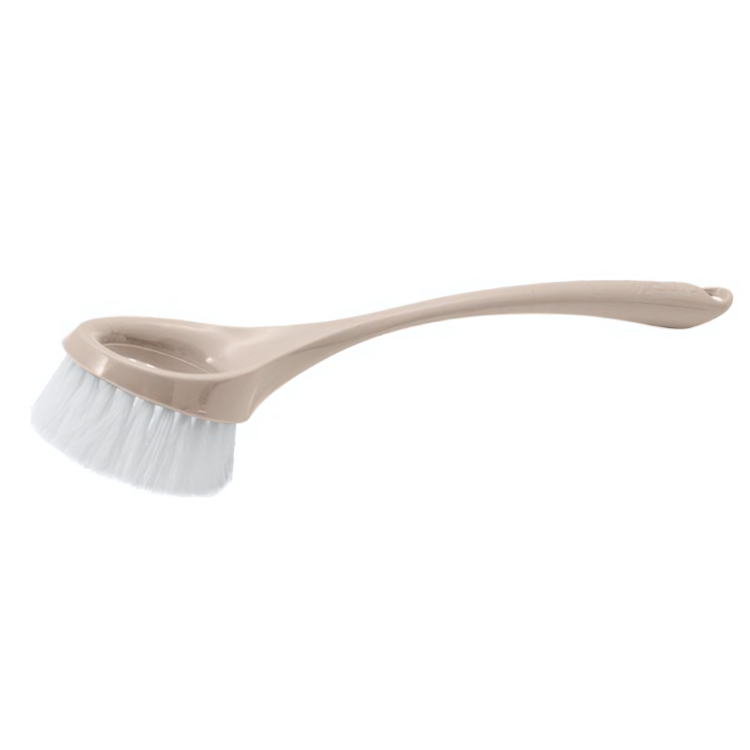 Изогнутая ручка удобно лежит в руке и позволяет тщательно очищать кастрюли, сковороды, тарелки и столовые приборы. Густая упругая щетина расположена под углом, благодаря чему легко проникает в изгибы и труднодоступные участки. Форма головки обеспечивает точное прилегание к поверхности посуды.