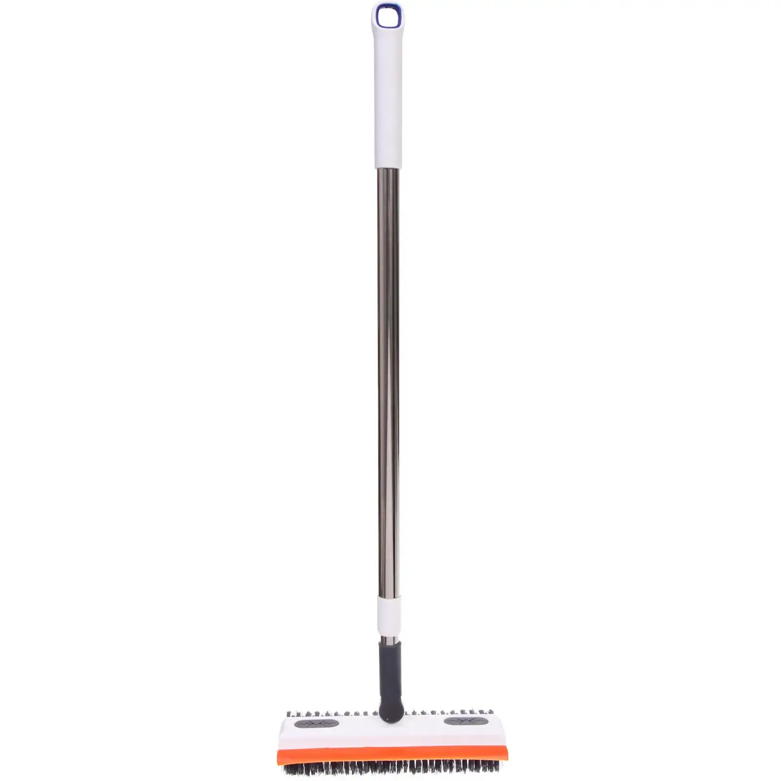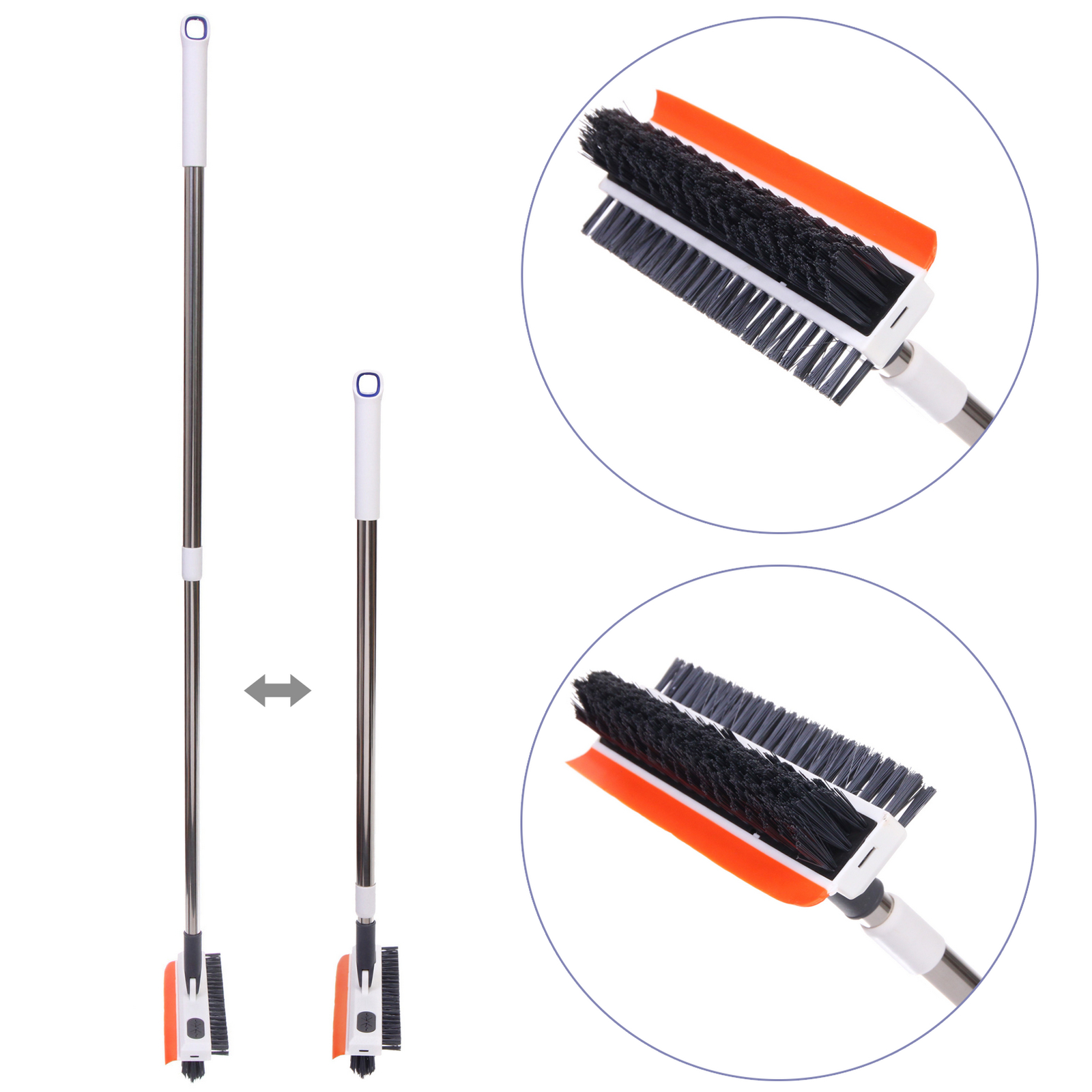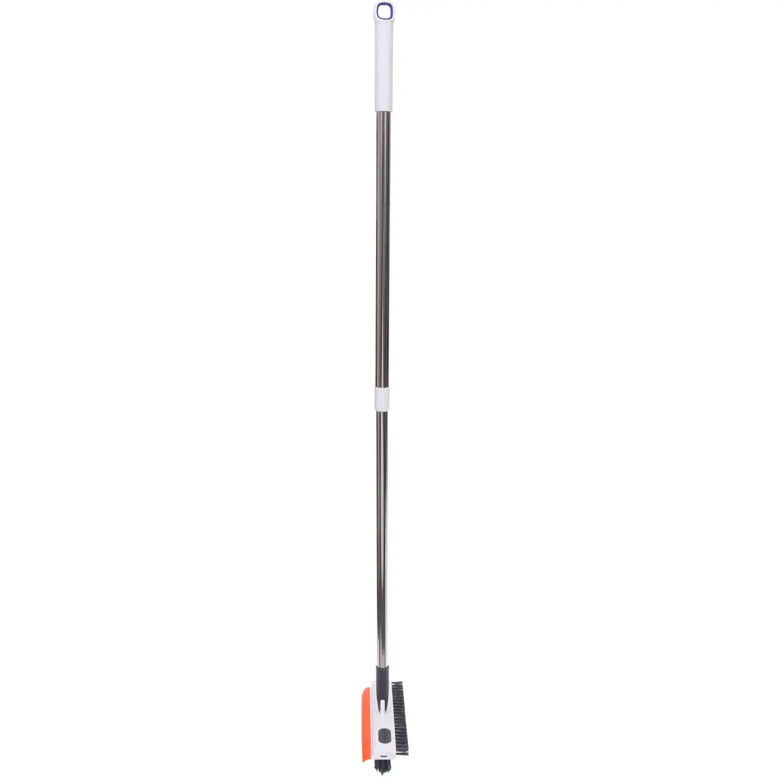 Изделие изготовлено из прочного пластика и металла, имеет эргономичную ручку белого цвета с оранжевыми акцентами. Длина щетки регулируется, что делает ее использование максимально комфортным.