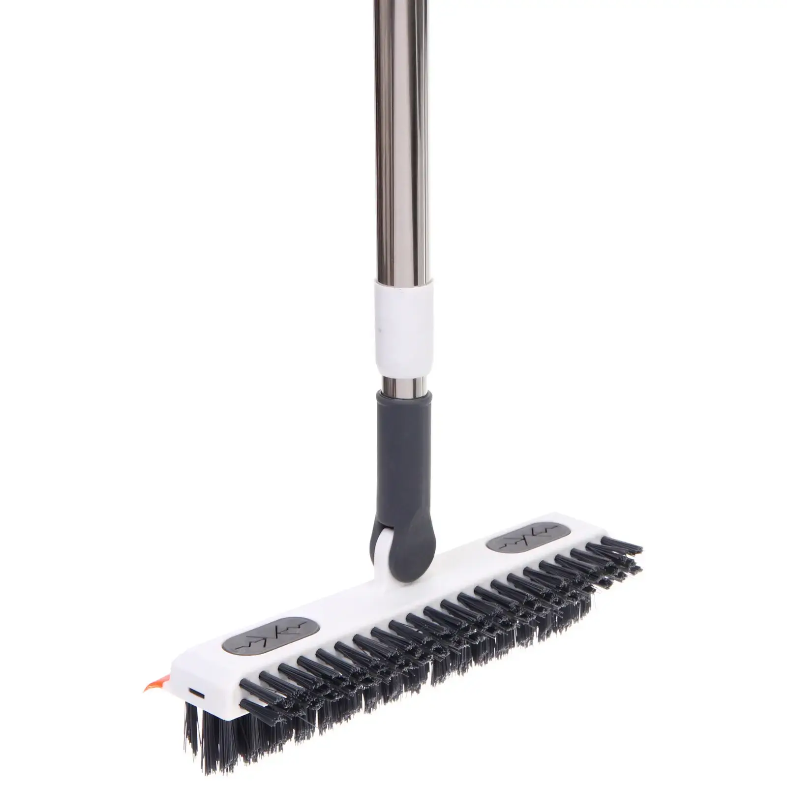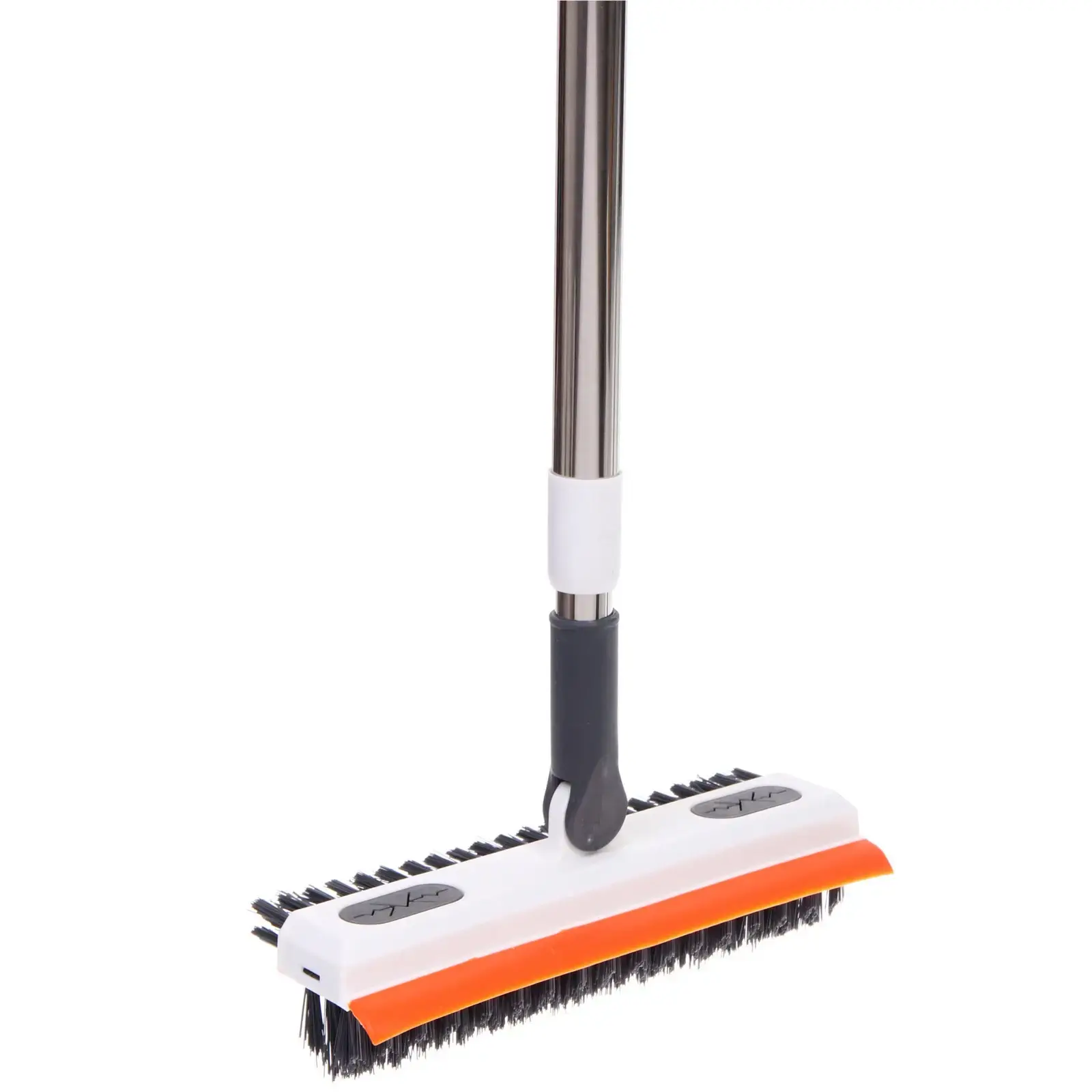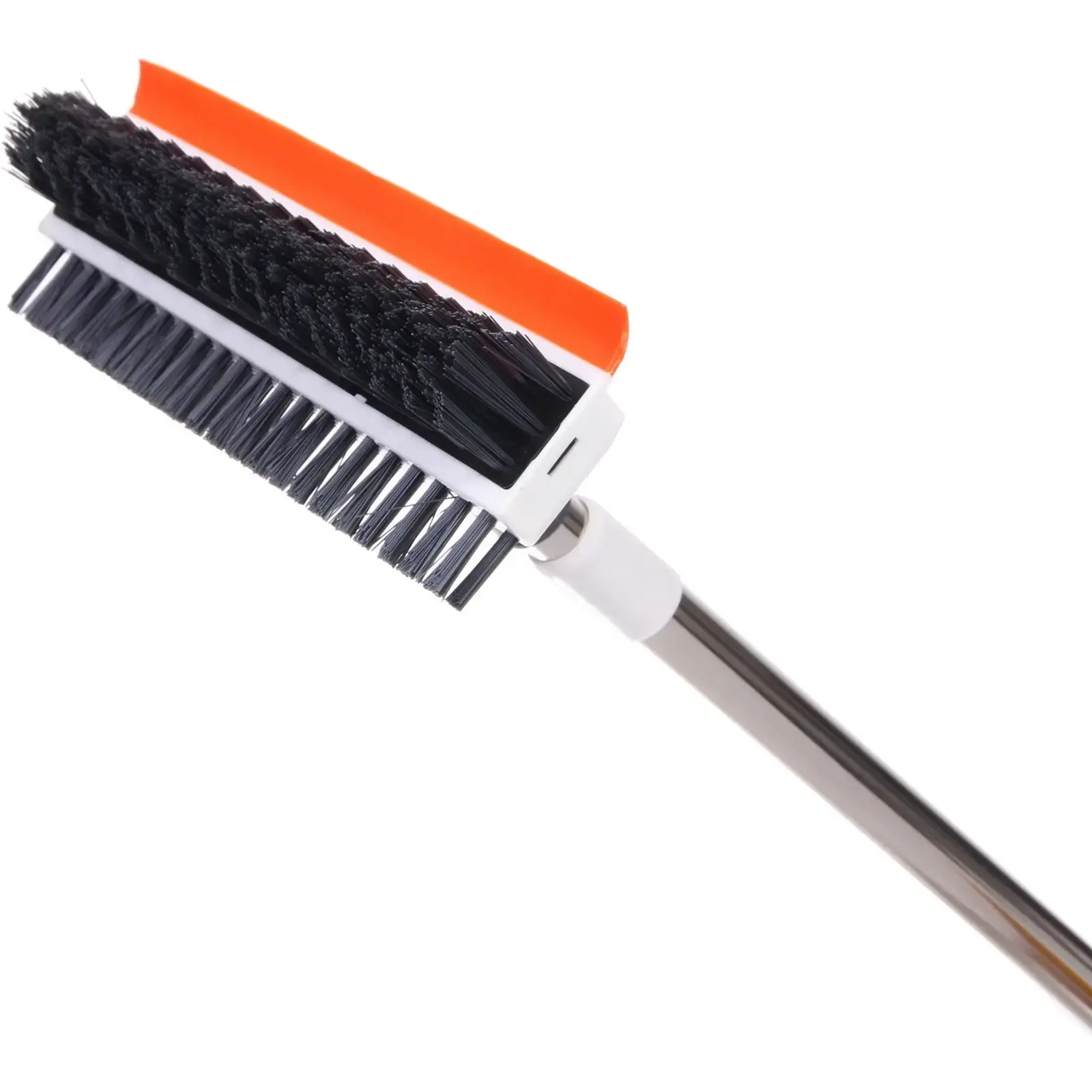 Изделие изготовлено из прочного пластика и металла, имеет эргономичную ручку белого цвета с оранжевыми акцентами. Длина щетки регулируется, что делает ее использование максимально комфортным.