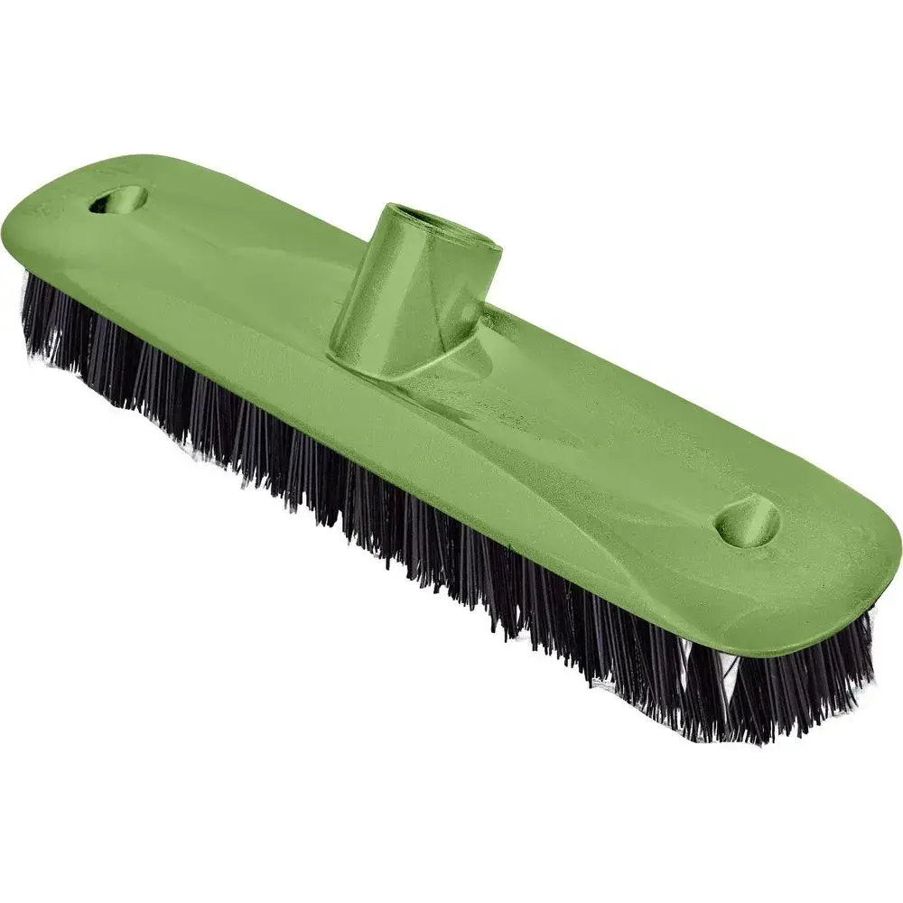 Основание выполнено из высококачественного пластика зеленого цвета, щетина - черного цвета. Центральное отверстие обеспечивает надежную фиксацию к стандартным ручкам для уборки.