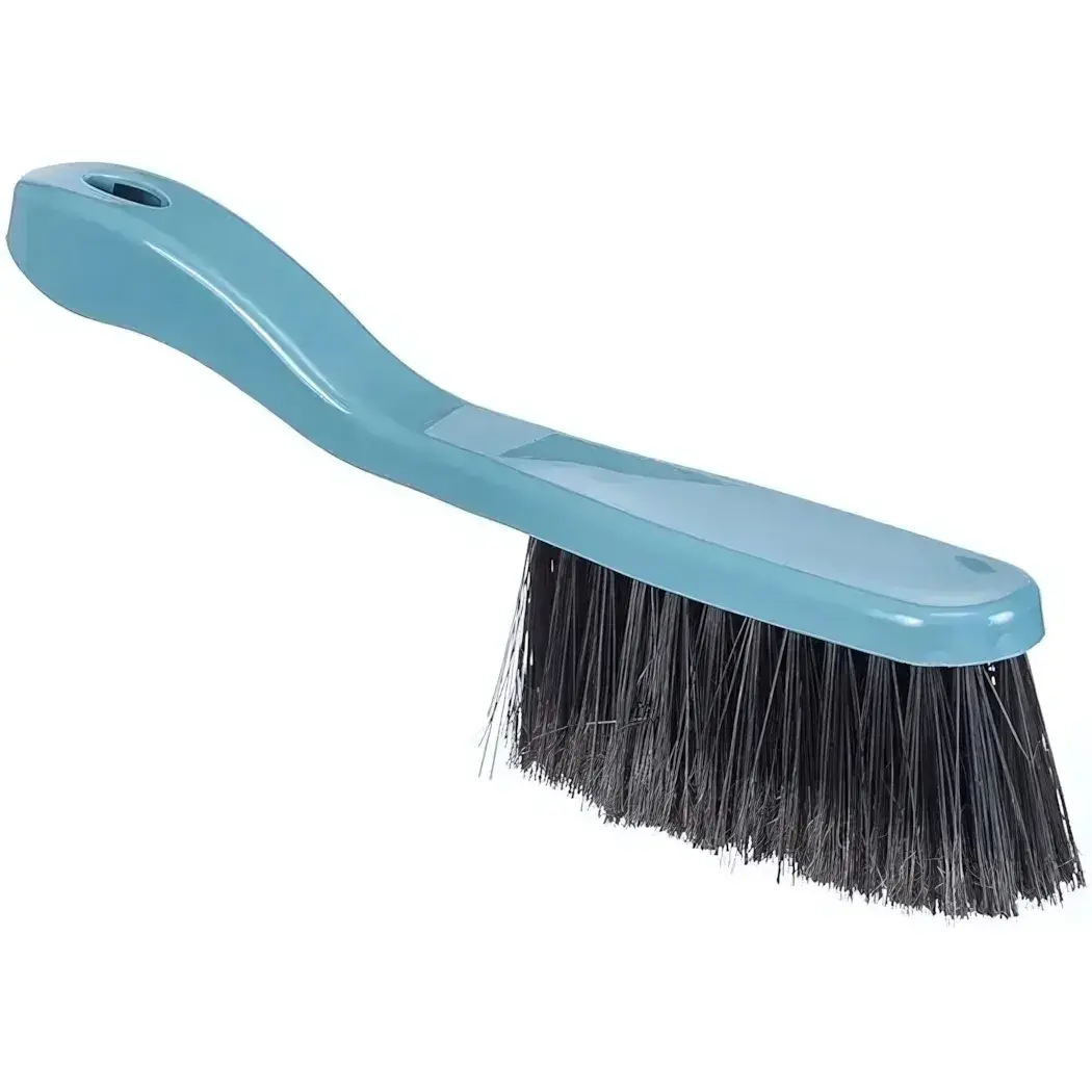 Светло-голубая пластиковая ручка с овальным отверстием обеспечивает удобное хранение. Жесткая черная щетина износостойкого типа гарантирует долгий срок службы. Эргономичный изгиб уменьшает нагрузку на кисть во время уборки.